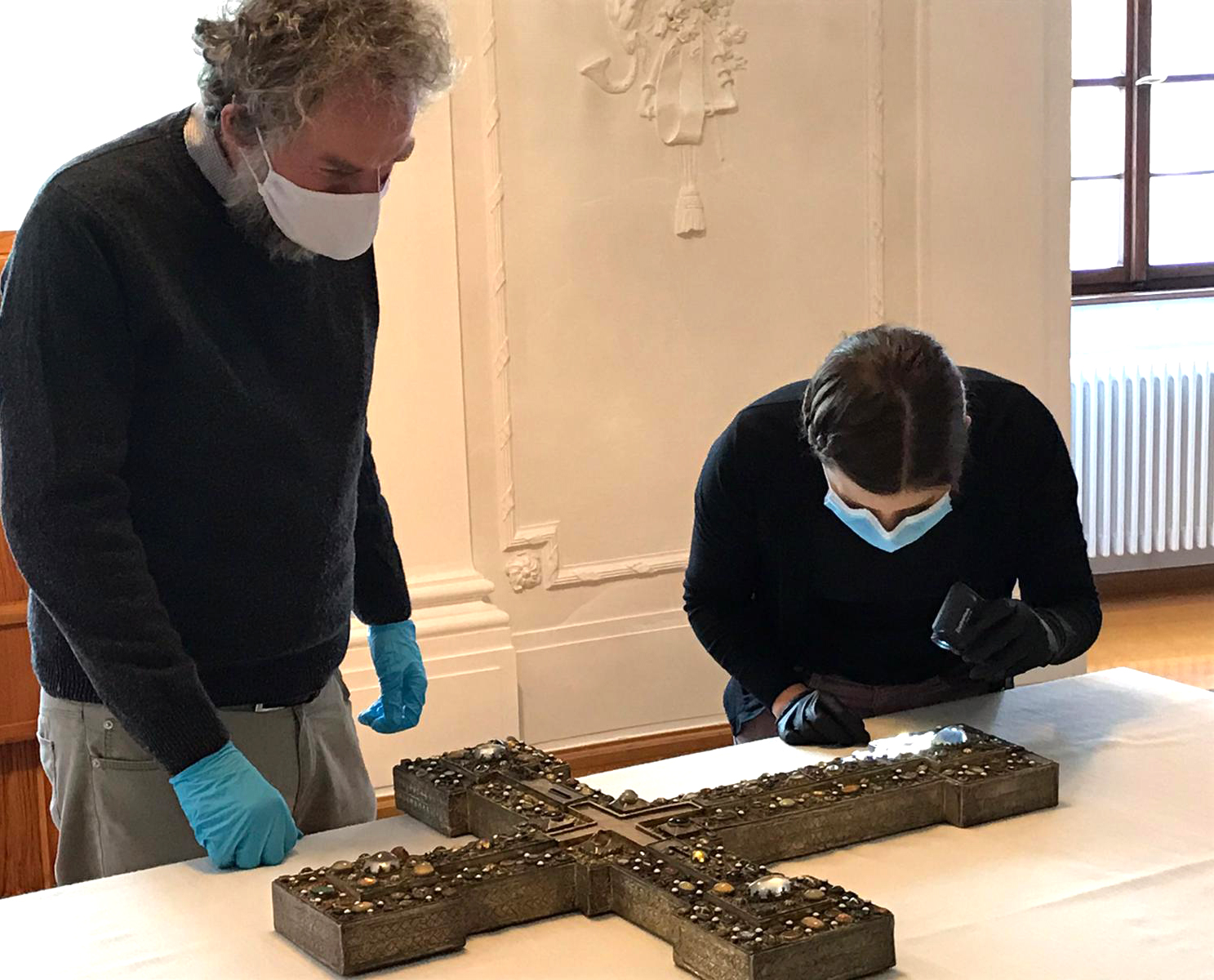 Guido Linke (Kurator) und Sabrina Kunz (Restauratorin) des Augustinermuseums in Freiburg begutachteten heute am Kolleg zusammen mit Kollegsgeschäftsführer Daniel Poznanski das Adelheid-Kreuz in unserer Hauskapelle, welches auf Reisen gehen und bei Ausstellungen in Freiburg und Mainz gezeigt werden soll.