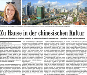 10.12.2016 (Badische Zeitung): Caroline von dem Bongart, Schülerin am Kolleg St. Blasien, ist Chinesisch-Weltmeisterin