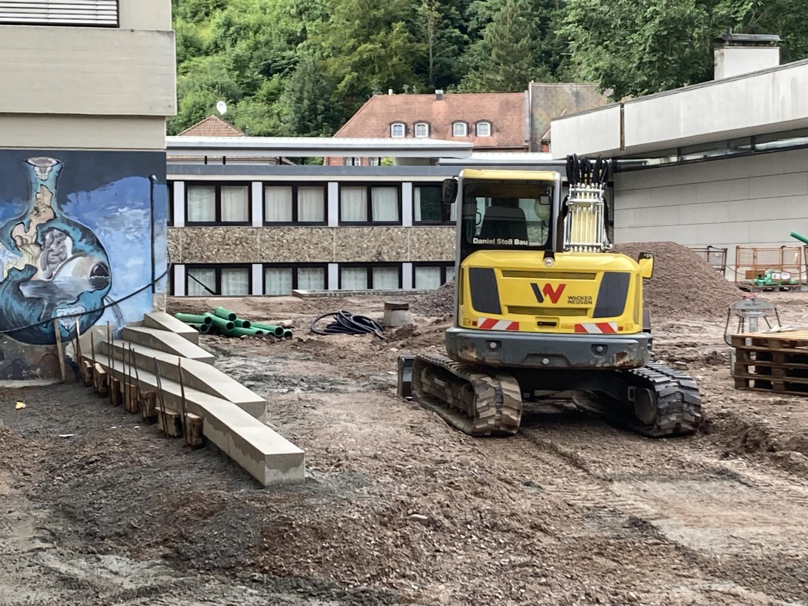 Über die Sommerferien hat die Firma Stoll Tiefbau aus Todtnau große Fortschritte bei der Gestaltung der Außenanlagen gemacht. Der Platz zwischen Kolleg und NaWi-Gebäude wurde neugestaltet und bietet nun einen attraktiven Pausenbereich, einen barrierefreien Zugang zwischen den Gebäuden, einen Biergarten für den Partykeller sowie die neue Verbindung zum Musikhaus Bleiche. Auch die Flächen zwischen NaWi-Gebäude und Sport-Campus wurden und werden ansprechend gestaltet.