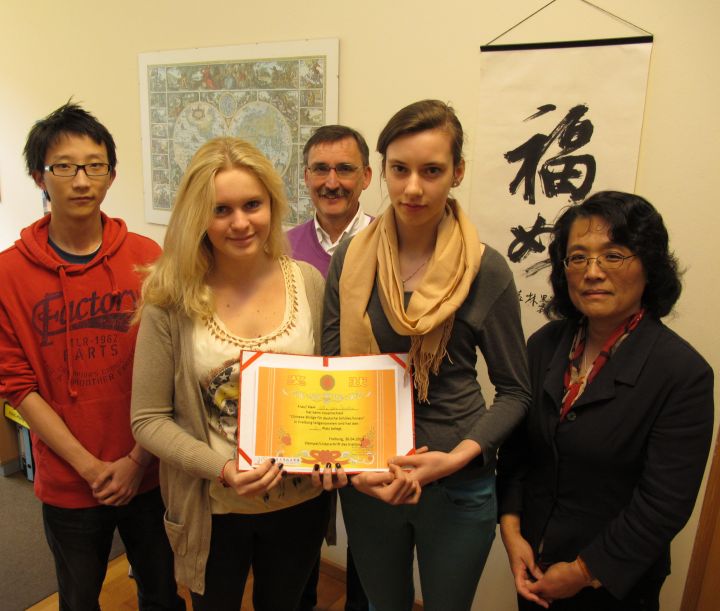 Beim baden-württembergischen Vorentscheid für den internationalen Chinesisch-Wettbewerb Chinese Bridge 2013 erzielte Antonia von Klot (Kl.9b) den ersten Platz und Colin van Senden (KS 11) den zweiten Platz. Die erfolgreiche Vorauswahl fand Ende April am Konfuzius-Institut an der Universität Freiburg statt. Dieser erfreuliche Doppelerfolg bestätigt das Niveau der Chinesisch-Kenntnisse von den beiden Kollegianerinnen. Von jeder Preisträgerin wurde ein Kurzvortrag in chinesischer Sprache zu einem chinabezogenen Thema, die Beantwortung von landeskundlichen Aufgaben und eine kulturelle Darbietung erwartet. Die Gewinner sind zur deutschlandweiten Endrunde an der Freien Universität Berlin eingeladen.