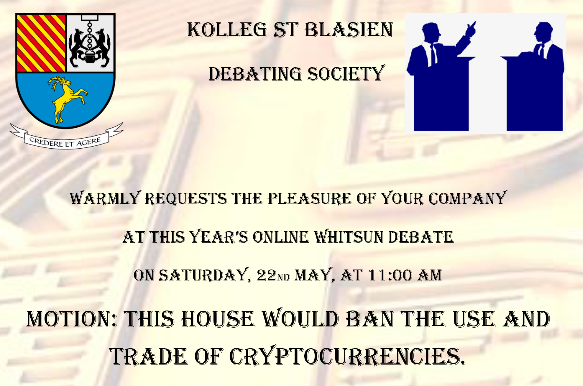 Der English Debating Club am Kolleg lädt am Pfingstsamstag (22. Mai) zur traditionellen Pfingstdebatte ein. Kollegianerinnen und Kollegianer debattieren zum Thema: "This House would ban the use and trade of cryptocurrencies". Erstmalig wird die Debatte am Pfingstsamstag um 11:00 Uhr per Live-Stream auf unserem YouTube-Kanal übertragen. Darüber hinaus können sich Gäste aus der Kollegsgemeinschaft bis zum 20. Mai anmelden, um nach den Hauptreden aus dem Publikum Fragen zu stellen oder ihre Meinung zu äußern. Ausführliche Informationen zur Anmeldung gibt es in der Einladung mit Datenschutzerklärung (Download).
