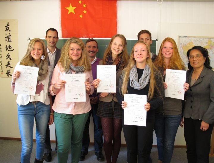 Mit großer Freude haben neun Chinesisch-Schüler am Freitagvormittag von Schulleiter Dr. Müller die Zertifikate für die bestandenen HSK-Prüfungen (Level 3) erhalten. Müller bekundete den Kollegianern gegenüber seine große Anerkennung für diese sehr erfreuliche Leistung. Erneut ermöglichte die Fachschaft Chinesisch die Teilnahme an den HSK-Prüfungen (Hanyu Shuiping Kaoshi). Kurz vor den Sommerferien haben die Oberstufenschüler im Konfuzius-Institut an der Universität Freiburg den Sprachtest für Chinesisch als Fremdsprache absolviert. Alle Schülerinnen und Schüler haben bei diesen Prüfungen sehr gute Ergebnisse erzielt – wir gratulieren zu diesem schönen Erfolg! Dieser Zertifikatsgrad gilt als Mindestanforderung für ein Studium an einer chinesischen Universität.