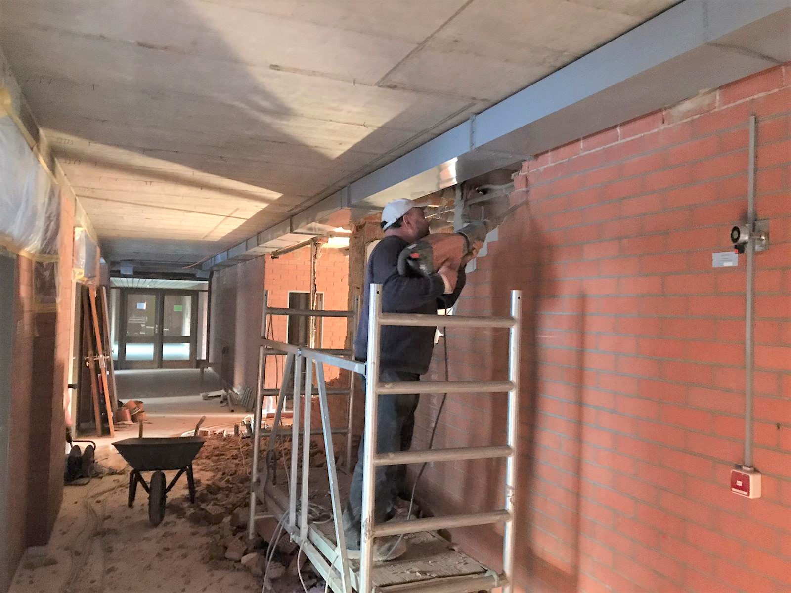 Mit Beginn der Fastnachtsferien starten die lärmintensiven Abbrucharbeiten im Ostflügel. In den kommenden Jahren wird der Ostflügel saniert, der aus dem Jahr 1972 stammt. Zuerst kommt die erste Etage dran, diese ist bereits seit dem letztem Jahr freigezogen und ausgeräumt. In drei Bauabschnitten über drei Jahre soll dieser Gebäudeteil von Grund auf erneuert werden: energetische Sanierung (Innendämmung), völlig neue Internatszimmer (drei Zimmer werden zu einem Duozimmer mit Dusche zusammengelegt), neue Versorgungsleitungen, einen Lounge-Bereich auf jeder Etage und eine komplett neue Gebäudetechnik.