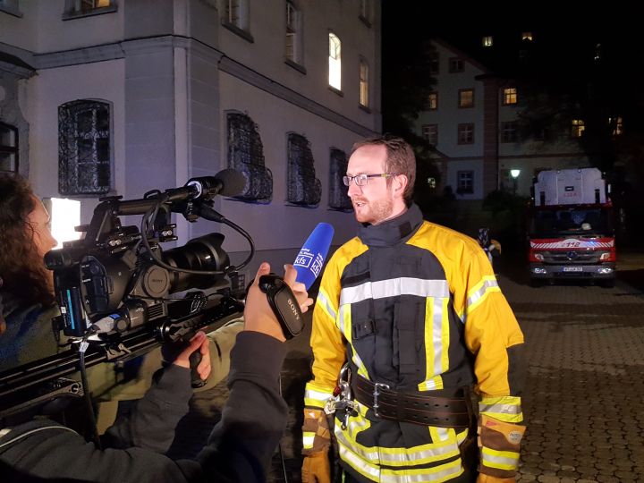 Am Montagabend (15. Oktober) fand eine große Übung der Feuerwehr St. Blasien am Kolleg statt. Unter der Leitung von stellv. Feuerwehrkommandant Tobias Schneider und Kollegsfeuerwehrmann Manuel Albiez wurde die Rettung von drei Jugendlichen aus dem Wohntrakt „Klösterle“ geübt. Dicke Rauchwolken drangen aus dem Gebäudeteil und erschwerten die Evakuierung für die Einsatzkräfte. Das Kollegsfernsehen (KFS) begleitete den Kollegslehrer und Feuerwehrmann David Wagner hautnah in diesem Einsatz.