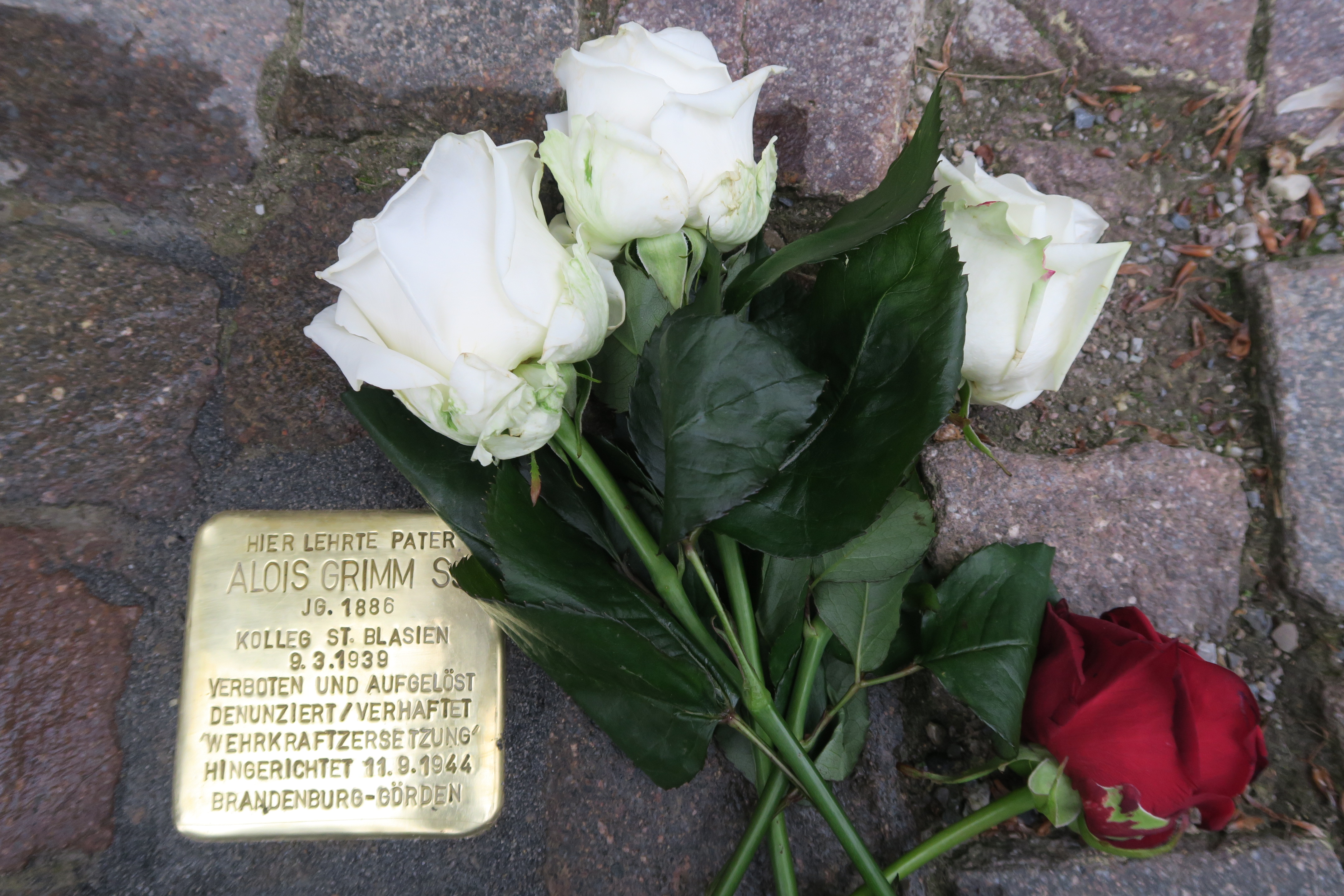 Am Mittwochvormittag (24. Mai) sind nach einem schönen Gottesdienst in der Hauskapelle insgesamt neun Stolpersteine in St. Blasien verlegt worden. Dabei nahmen auch Nachfahren der Vertriebenen aus dem Ausland teil. Die Stolpersteine erinnern an Menschen, die in der Zeit des Nationalsozialismus verfolgt wurden. Seit Schuljahresbeginn erforschte der Kolleg-Seminarkurs „Gegen das Vergessen“ im Unterricht die Geschichten von Bürgerinnen und Bürgern, die während des NS-Regimes in der Stadt ihre Heimat verloren haben. Die neun Kollegsschülerinnen und -schüler haben unter der Leitung von Alena Bauer und Johannes Heitmann die Biografien von neun Menschen recherchiert. Zum Gedenken an diese von den Nazis verfolgten Frauen und Männer haben sie in der Domstadt Stolpersteine verlegt für: Gustav, Hulda (geb. Dreifuss), Alfred und Gertrude Grumbach, Hugo Lazarus, Lilli (geb. Günzburger) und Ellen Frances Grumbach, Alexander Mendelsohn und Pater Alois Grimm SJ. Die Geschichten der Vertriebenen und Informationen zu dem Projekt sind im digitalen Gedenkbuch zu finden