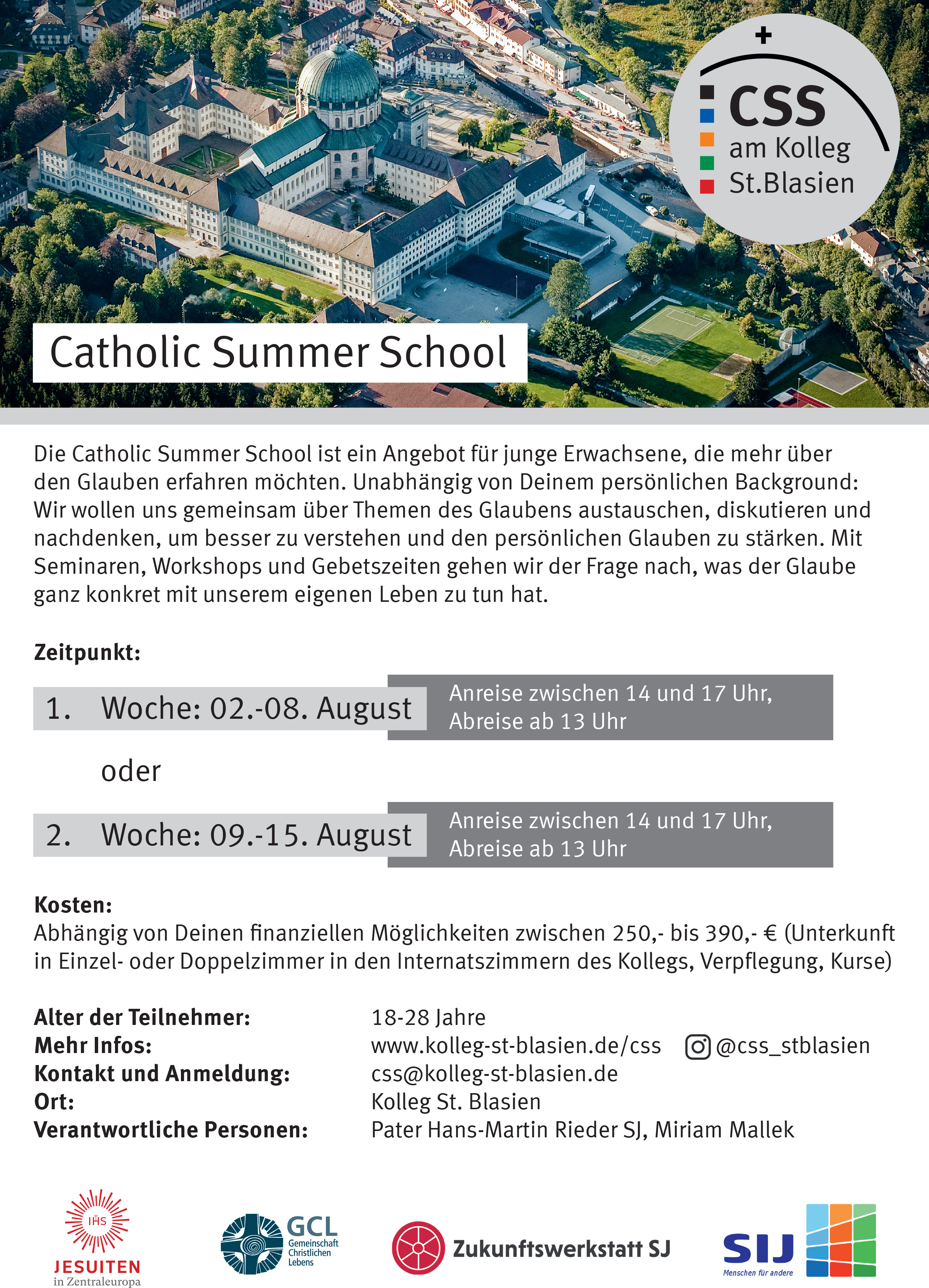 Die Catholic Summer School (CSS) am Kolleg richtet sich in diesem Sommer zum ersten Mal an junge Erwachsene, die mehr über den katholischen Glauben erfahren und ihr persönliches Glaubensleben vertiefen möchten. Dazu gibt es in zwei verschiedenen Wochen ein vielfältiges Angebot an Workshops, Seminaren, Vorlesungen und gemeinsamen Gebetszeiten in den klösterlichen Gebäuden des Kollegs.