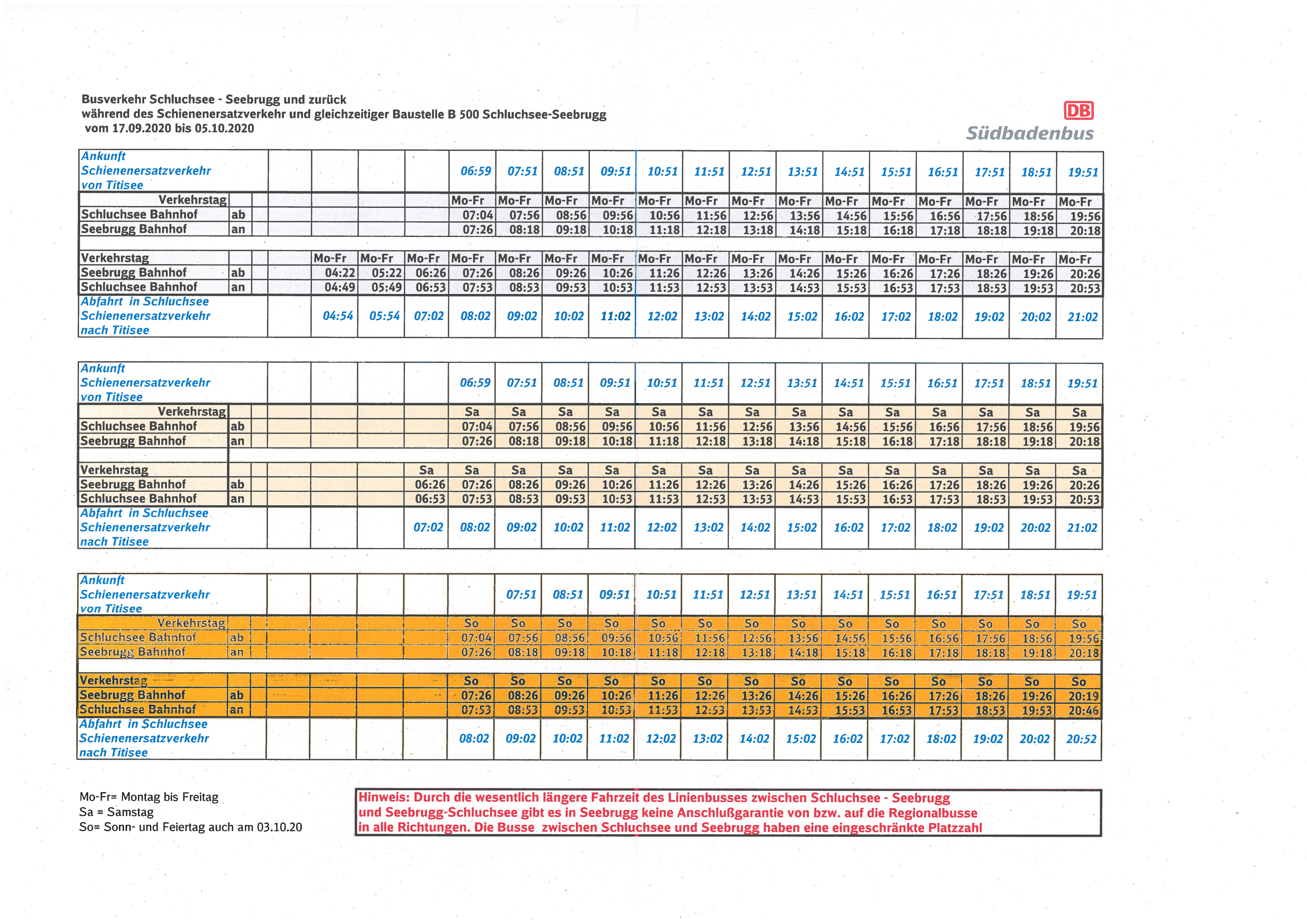 Es gibt vom 2. September bis 12. Dezember 2020 einen Schienenersatzverkehr (SEV) auf der Dreiseenbahn. Zudem wird die B 500 zwischen Schluchsee und Seebrugg aufgrund von Belagsarbeiten in der Zeit vom 17. September bis 5. Oktober 2020 für den Verkehr voll gesperrt sein. Das Landratsamt Waldshut informiert über die Auswirkungen dieser beiden Maßnahmen: