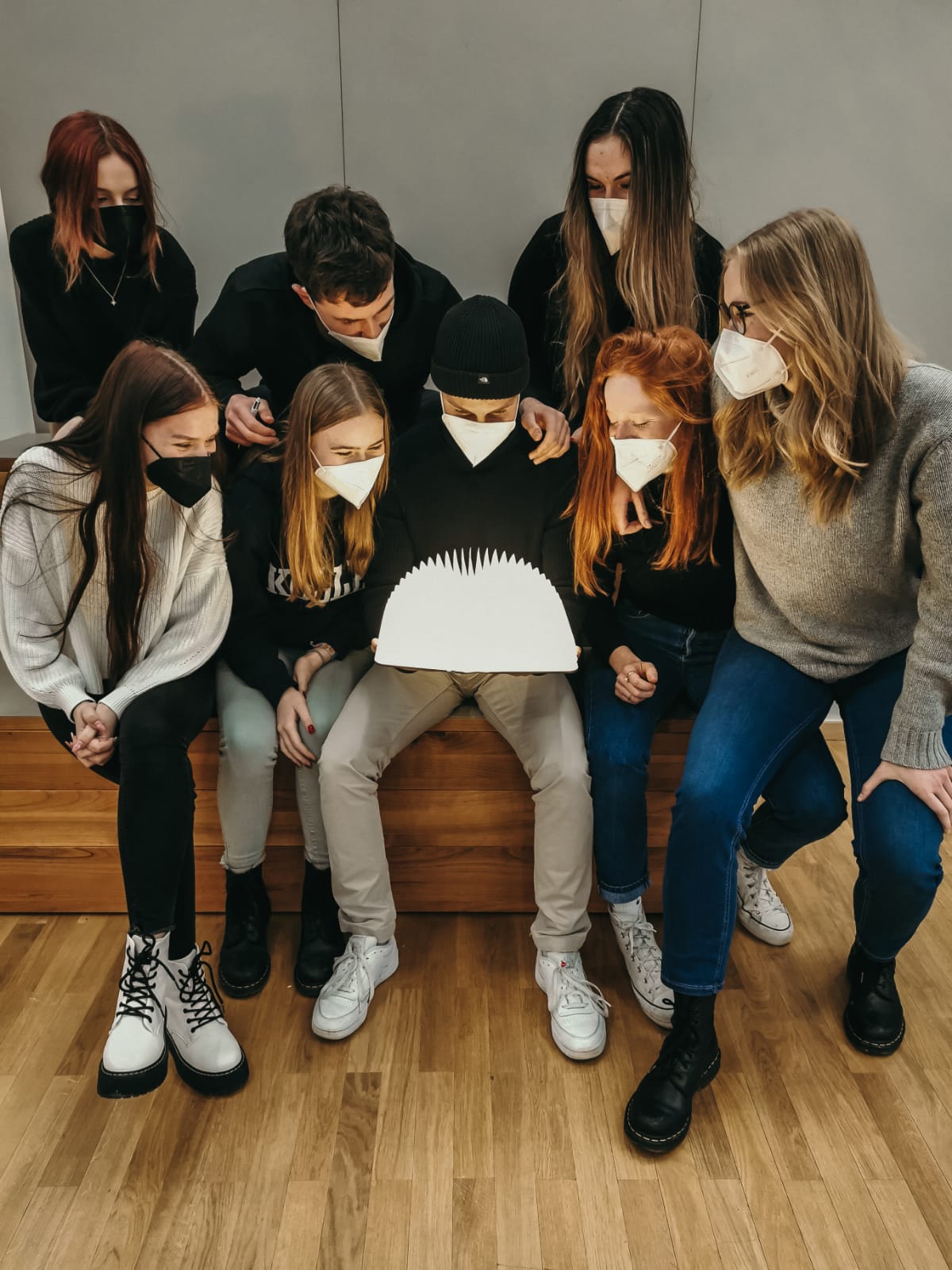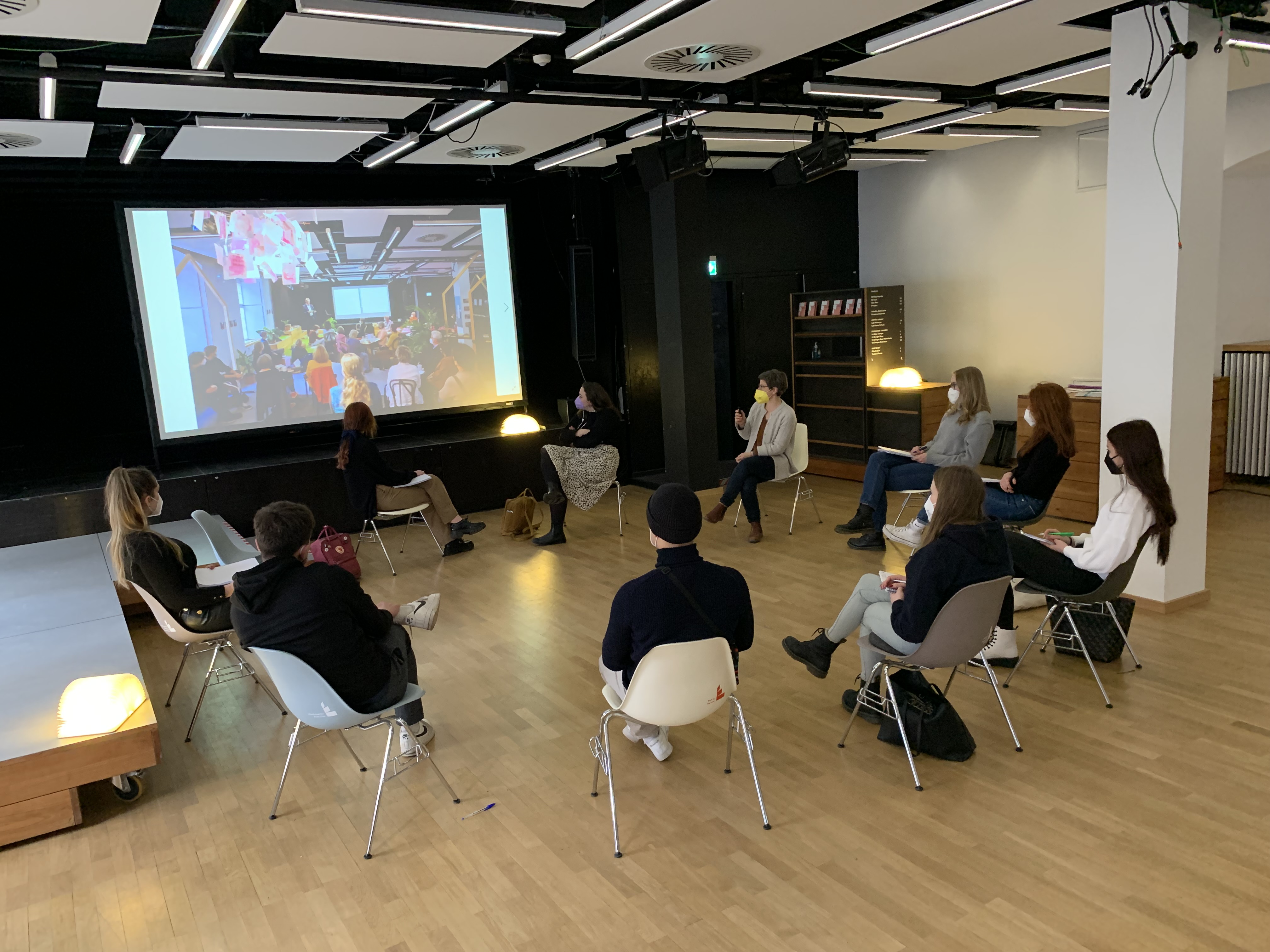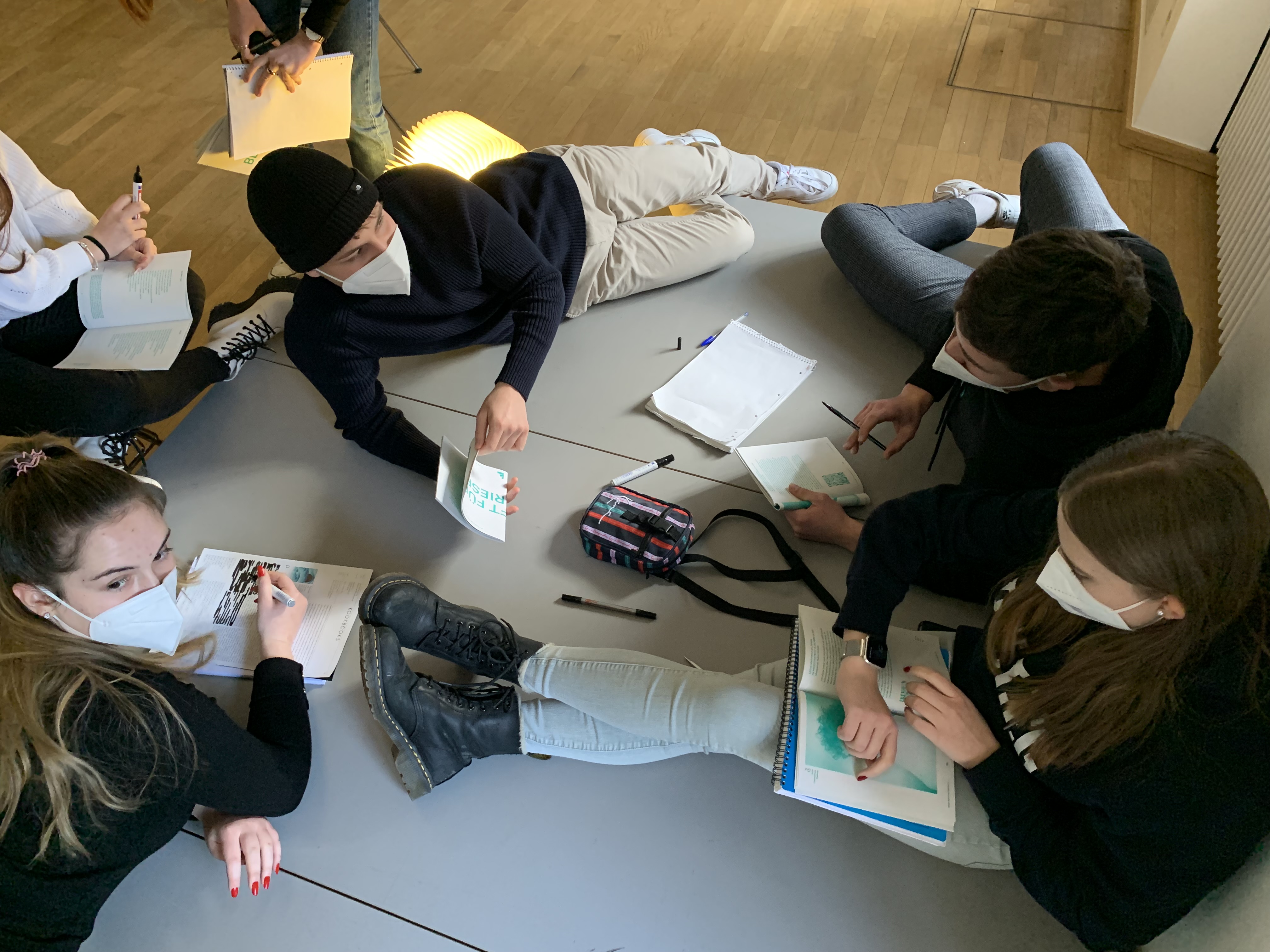 Nach einer kurzen Mittagspause bekamen sie einen Einblick in das Literaturhaus Freiburg. Zuerst saß die Gruppe in einem Kreis zusammen und tauschten sich über zuletzt gelesene Bücher aus. Schnell bemerkten sie, dass im Literaturhaus die Liebe zur Literatur genauso wichtig ist wie die Kommunikation miteinander. Es gibt dort zahlreiche Veranstaltungen: Lesungen im Freien, in Studentenwohnheimen, für Kinder, im kleinen und im großen Kreis. Bei der Vorstellung des Literaturhauses durch Frau Birgit Güde haben die Kollegianerinnen und Kollegianer festgestellt, dass die Lesungen ganz anders ablaufen als erwartet: Meistens steht auch hier Kommunikation im Vordergrund und es entstehen offene Gespräche. Es war sehr interessant, zu sehen, wie vielfältig Literatur sein kann. Um dies zu verdeutlichen, machte Birgit Güde einen Workshop mit dem Literatur-Kurs. Sie vervollständigten selbst Gedichte oder konnten das sogenannte „Blackout Poetry“ umsetzen. Hierbei schwärzt man alle Wörter eines Textes mit einem Stift, sodass nur jene übrig bleiben, welche man für einen neuen Text gebrauchen kann. Dies kann man intuitiv oder gut überlegt machen. Danach lasen sie ihre Texte vor und waren überrascht, dass bei dieser kurzen Übung durchaus ansprechende Texte entstanden waren. Anschließend beendeten sie die gelungene Exkursion mit einem Abendessen und fuhren zurück ans Kolleg. (Lisa-Marie Bächle, KS11)