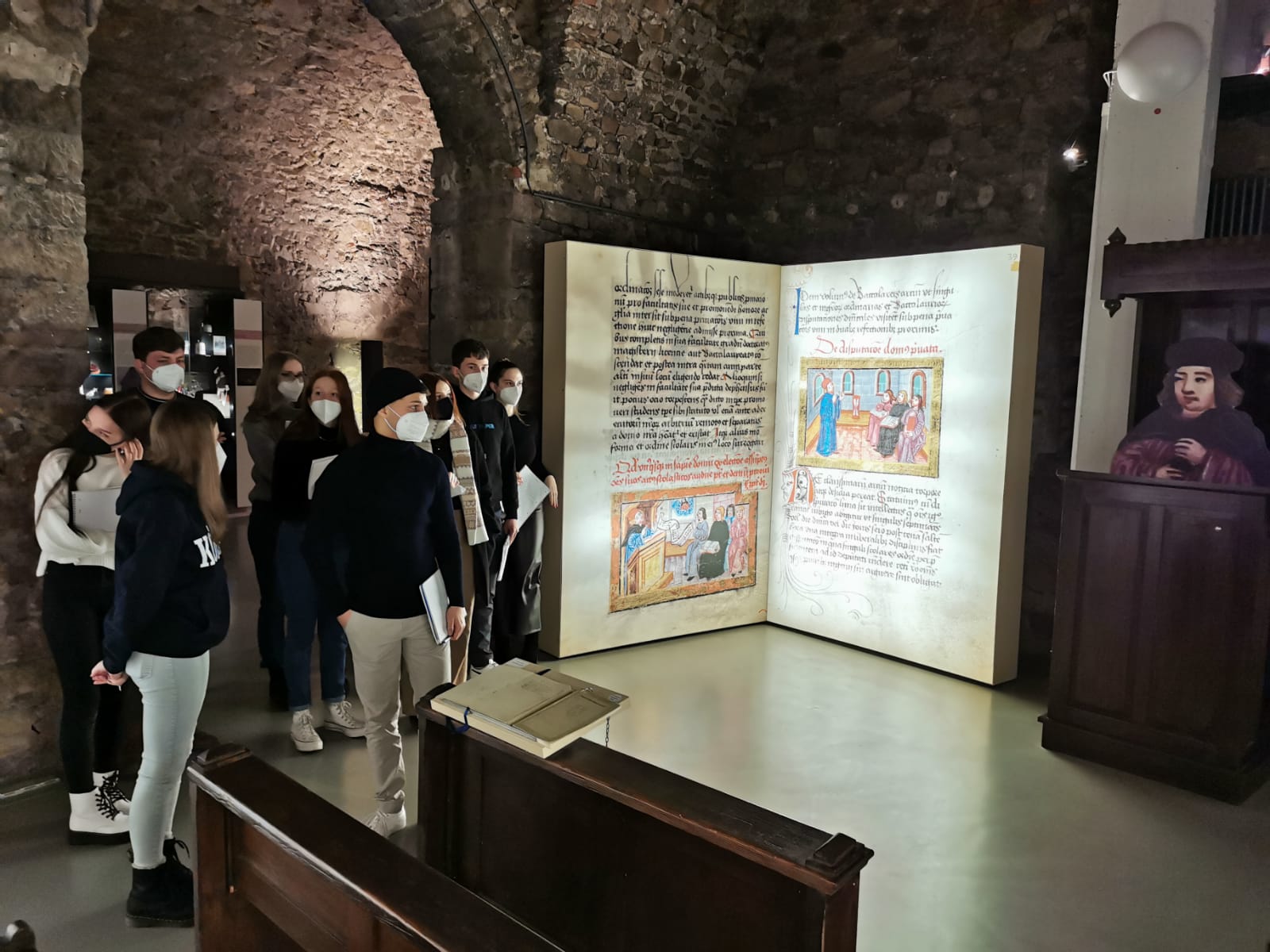 Am Donnerstag, den 27. Januar, trat der Literatur-Kurs KS 11 eine Exkursion mit Frau Bauer und Herrn Heitmann nach Freiburg an. Auf dem Weg zum ersten Programmpunkt dem Besuch des Uniseums kam die Gruppe zunächst am Mahnmal der alten Synagoge in Freiburg vorbei. Am Tag des Gedenkens an die Opfer des Nationalsozialismus nahmen sie sich Zeit, um die Tafel an der alten Synagoge zu lesen, bevor das eigentliche Ziel angesteuert wurde.