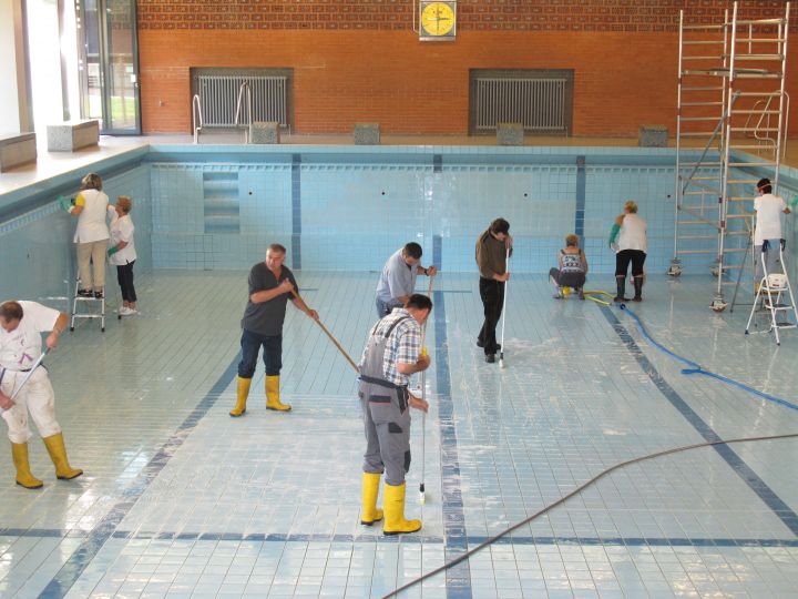 In der ersten Septemberwoche findet gegenwärtig die umfassende Grundreinigung des Schwimmbads im Kolleg statt. Nach den umfangreichen Reinigungsarbeiten des Schwimmbeckens erstrahlt das Bad zum neuen Schuljahr 2011/12 wieder in neuem Glanz. Das Schwimmbecken fasst übrigens 220 Kubikmeter Schwarzwaldwasser.