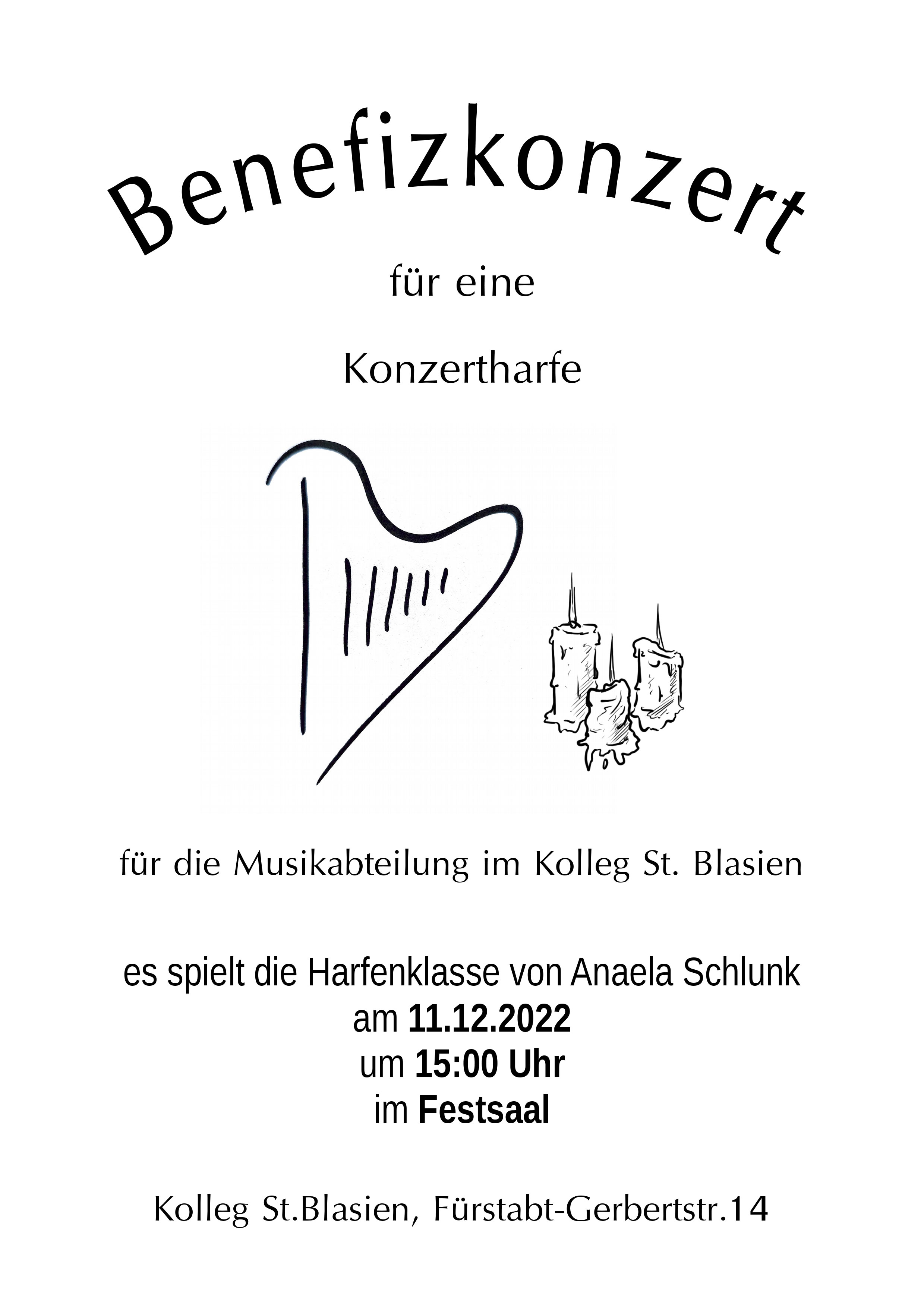 Am kommenden Sonntag, 11. Dezember findet um 15:00 Uhr ein Benefizkonzert für eine Konzertharfe im Festsaal des Kollegs statt. Es spielt die Harfenklasse von Frau Anaela Schlunk. Zehn Schüler vom Schul- bis Erwachsenenalter spielen ein vielfältiges Programm. Werke aus der irischen Harfenliteratur und eine Bearbeitung von Smetanas "Die Moldau" für Harfenduo werden zu hören sein. An diesem 3. Adventssonntag werden auch weihnachtliche Klänge erklingen.