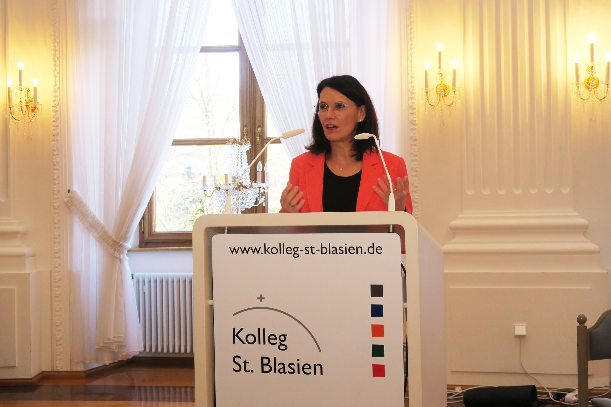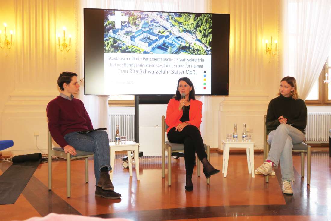 Am Montagvormittag, dem 5. Februar, besuchte Frau Rita Schwarzelühr-Sutter MdB (Parlamentarische Staatssekretärin) das Kolleg. Die Veranstaltung im Festsaal stand im Kontext des Gedenktags (2. Februar) für den Widerstandskämpfer P. Alfred Delp SJ und begann mit einem Impulsreferat von Frau Schwarzelühr-Sutter über die wehrhafte Demokratie und aktuelle politische Entwicklungen. In ihrem Referat betonte sie die Bedeutung des gesellschaftlichen Zusammenhalts in Zeiten geopolitischer und gesellschaftlicher Herausforderungen. Dabei ging sie auf aktuelle politische Themen und Strömungen ein und analysierte, wie die eigene Haltung dazu beitragen kann, demokratische Werte zu fördern und zu schützen. Nach dem Impulsreferat folgte eine lebhafte Diskussion mit den Schülerinnen und Schülern der Kursstufe 11. Diese hatten die Gelegenheit, eigene Fragen zu aktuellen Themen zu stellen, die ihnen auf den Nägeln brannten. Frau Schwarzelühr-Sutter nahm aktiv an der Diskussion teil und ermutigte die Schüler, ihre Meinung zu äußern. Das Themenspektrum der Diskussion reichte von Atomenergie bis zum öffentlichen Personennahverkehr, und die Schüler zeigten eindrucksvolles Interesse an den Diskussionen.