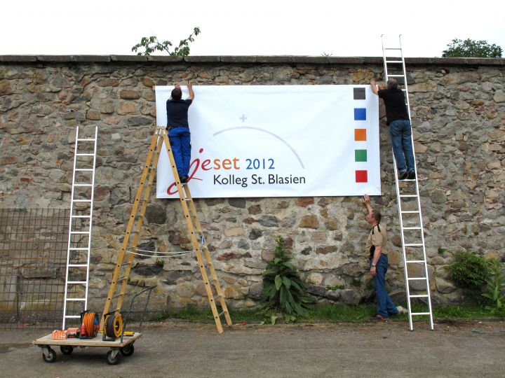 Die Vorbereitungen für das größte Sportereignis der europäischen Jesuitenschulen laufen auf Hochtouren. Die Fahnen der zehn Teilnehmerländer wurden am vergangenen Dienstag gehisst und die Planen mit dem JeSET-Logo angebracht. Es werden am Montag rund 400 Schülerinnen und Schüler von 22 Jesuitenschulen in Ägypten, Belgien, Dänemark, Deutschland, Irland, Italien, Kroatien, Litauen, Spanien und Ungarn erwartet. Die Sportwettkämpfe finden in sechs Disziplinen statt: Basketball, Cross Country, Fußball, Leichtathletik, Schwimmen und Volleyball. Davor finden noch die mündlichen Abiturprüfungen des Doppeljahrgangs einschließlich der großen Abschiedsfeiern statt.