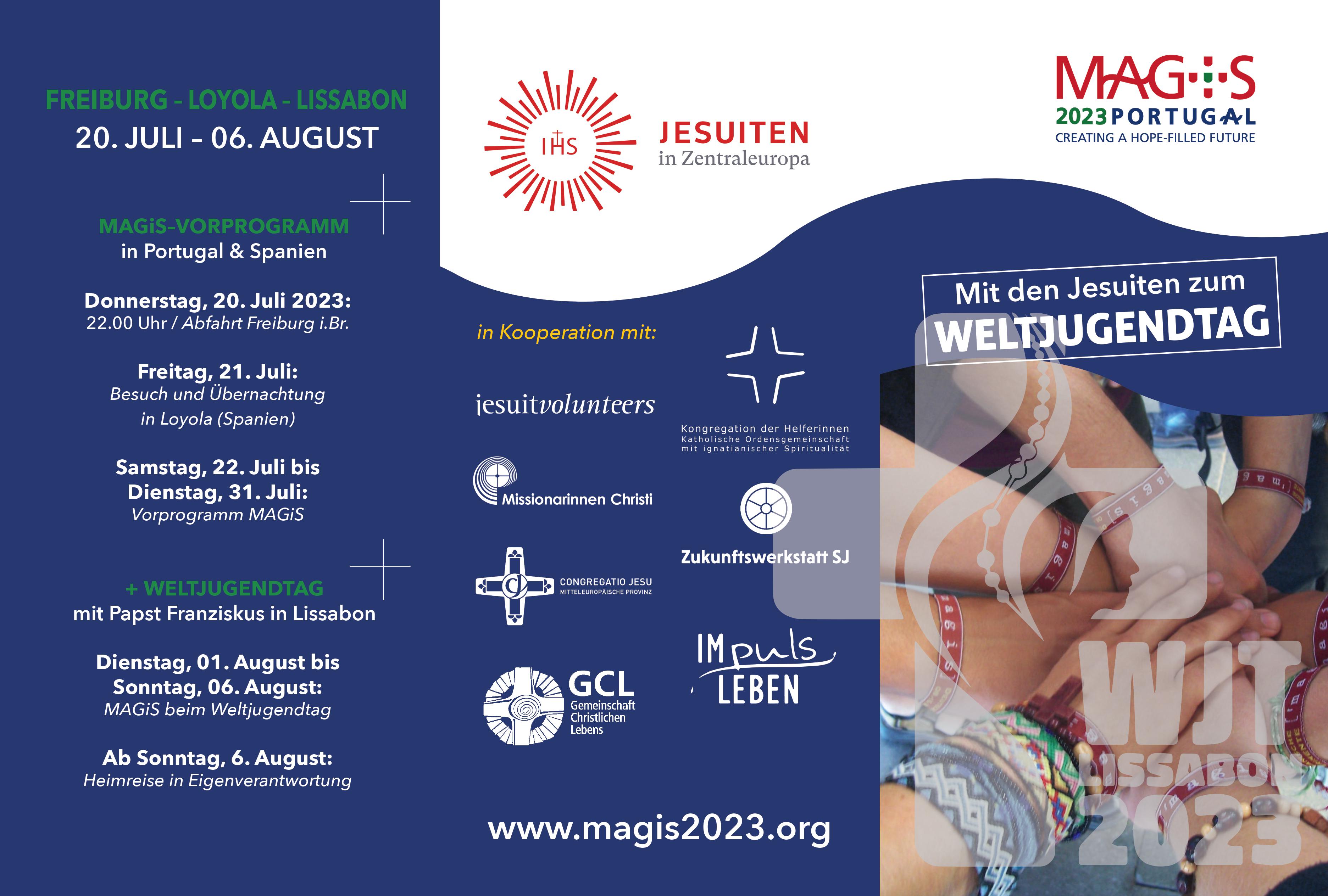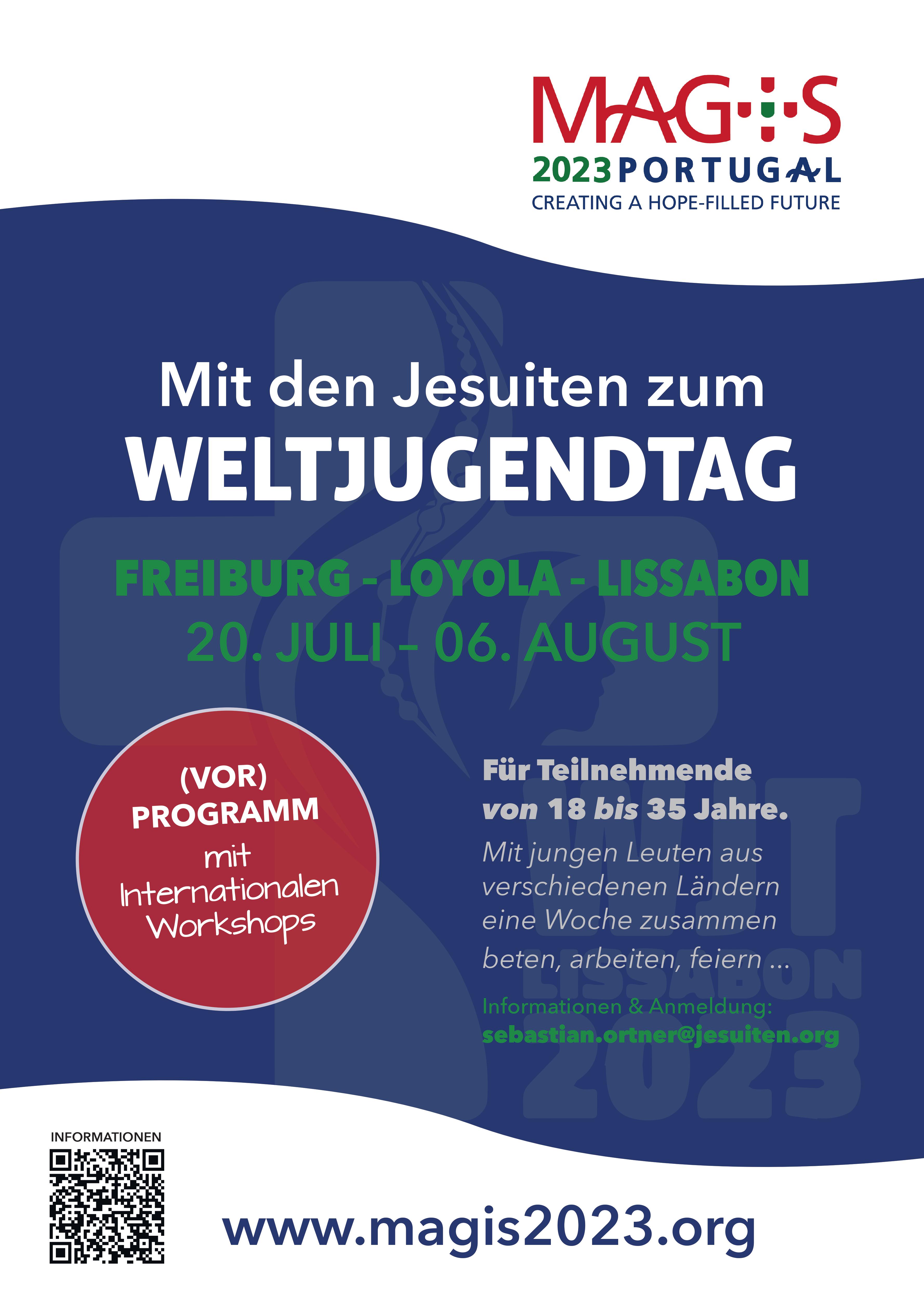 "Magis" heißt das Vorprogramm der Jesuiten zum diesjährigen Weltjugendtag in Lissabon. Erwartet werden rund 2.000 junge Menschen aus aller Welt, die in Portugal und Spanien an internationalen Workshops teilnehmen - darunter „Ignatianische Experimente“, Pilgern, Theater, Engagement mit Kindern oder behinderten Menschen und Kunstwerkstätten. Magis findet vom 22. bis 31. Juli 2023 in Lissabon statt. P. Sebastian Ortner SJ und P. Ludger Joos SJ organisieren eine Busfahrt von Deutschland aus. Sie startet am 20. Juli und führt von Freiburg im Breisgau über Loyola in Spanien bis nach Lissabon. Dort beginnt direkt im Anschluss an Magis der Weltjugendtag mit Papst Franziskus (1. bis 6. August).