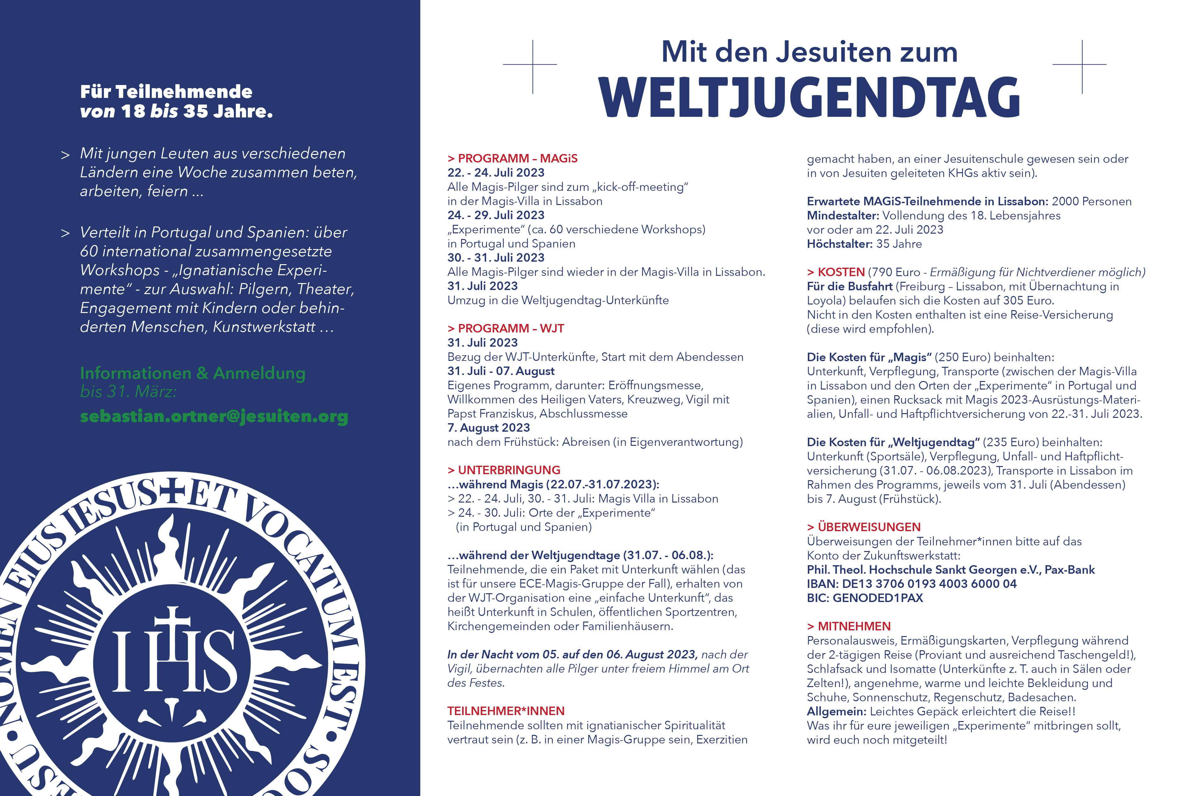 Teilnehmende an der Fahrt sollten zwischen 18 und 35 Jahre alt und mit ignatianischer Spiritualität vertraut sein, beispielsweise durch eine Magis-Gruppe, Exerzitien, den Besuch einer Jesuitenschule oder von Jesuiten geleiteten KHGs. Anmeldungen sind bis zum 31. März 2023 möglich.