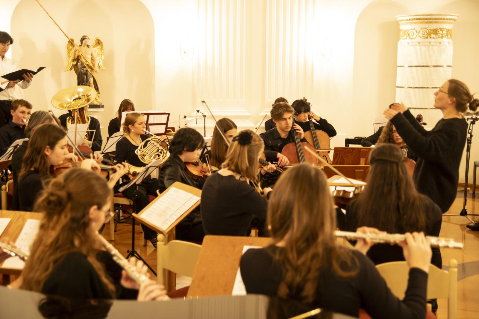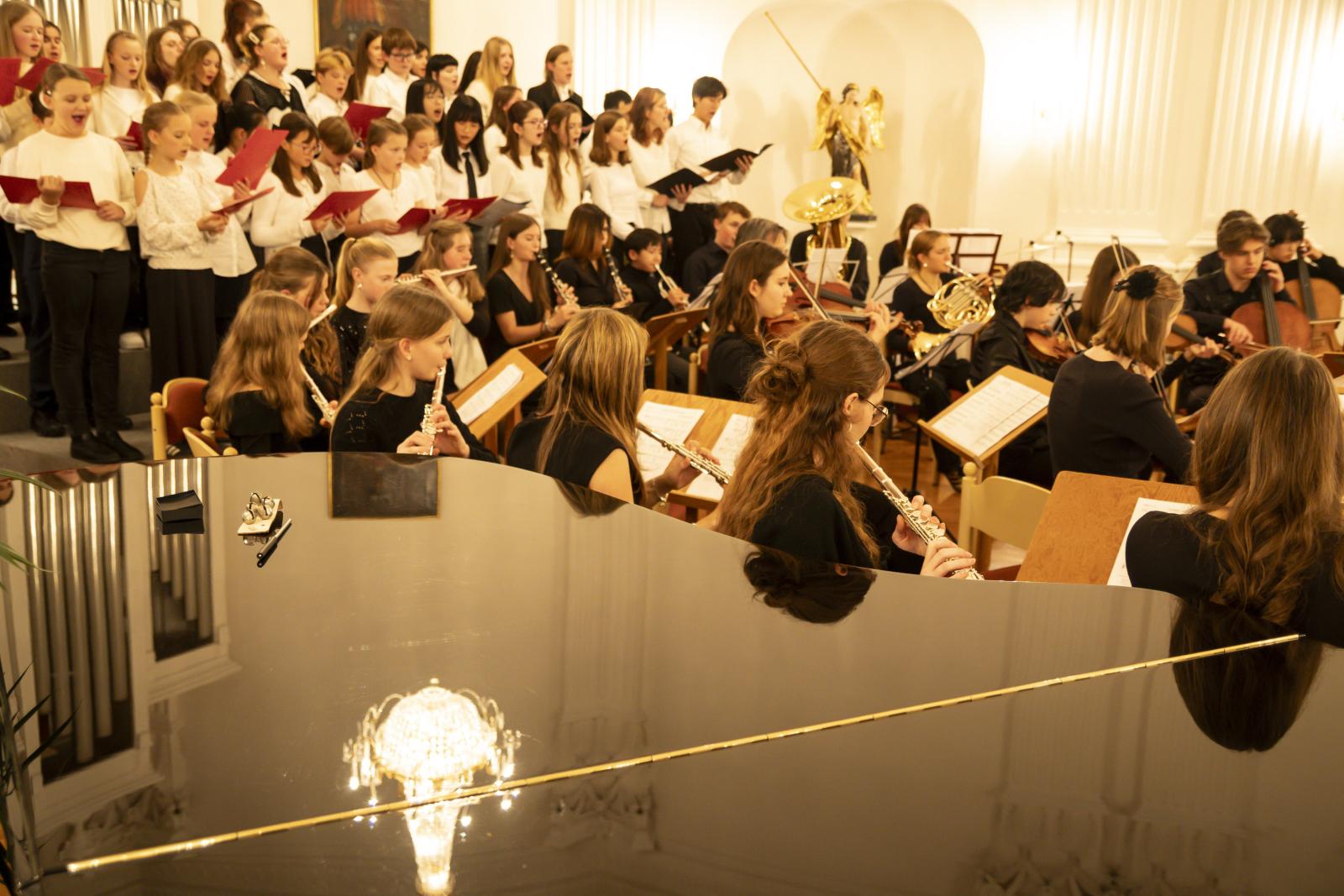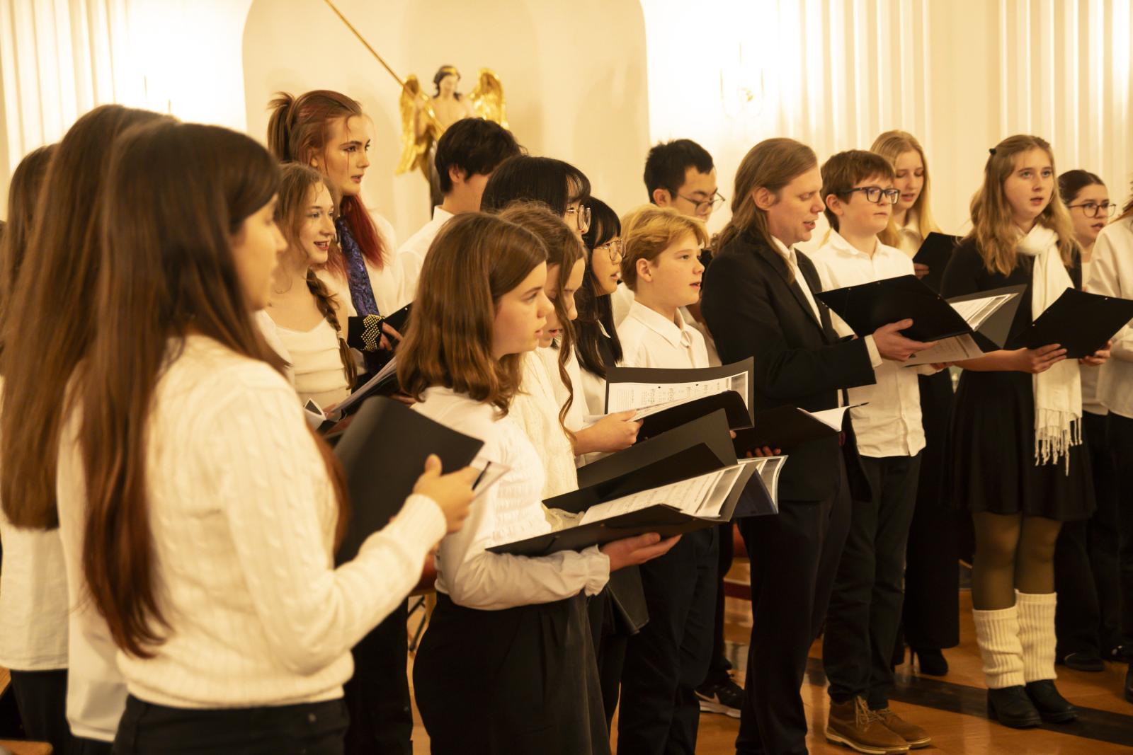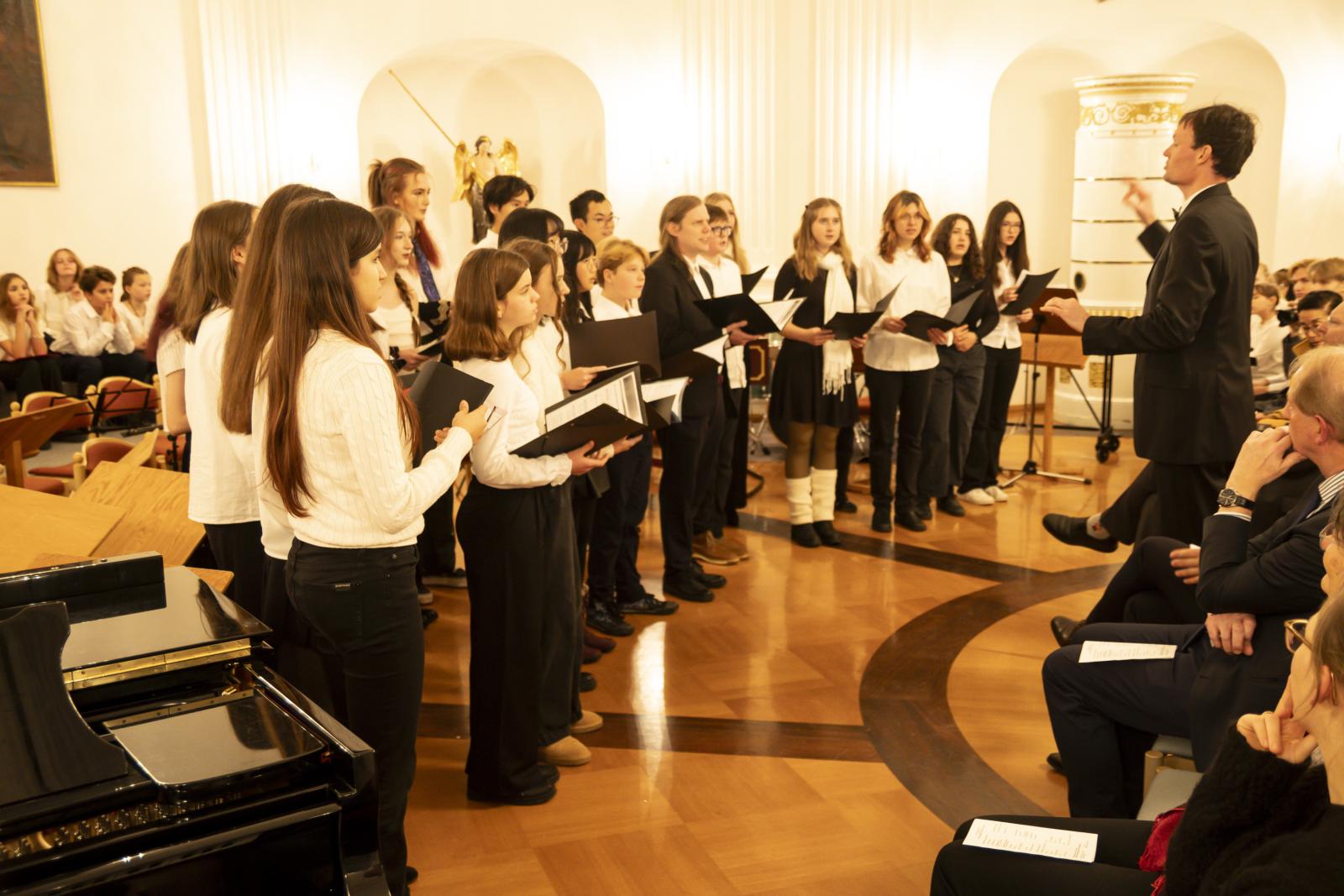 Am zweiten Adventswochenende erfüllte vorweihnachtliche Musik den Festsaal des Kollegs: Die traditionellen Adventskonzerte der Ensembles boten am Samstagabend und Sonntagnachmittag ein abwechslungsreiches Programm, das eindrucksvoll die Vielfalt der Musikkultur am Kolleg präsentierte. Unter der Leitung von Olaf Nießing (Orchester-AG), Maria Backhaus (Chor-AG), Florian Auls (Kollegs-Chor) und Viola Grömminger (Kollegs-Orchester) präsentierten Kollegianerinnen und Kollegianer ein musikalisches Konzertereignis aus geistlicher, klassischer, traditioneller und populärer Musik. Zum Konzertbeginn sorgten Bläser der Big Band (unter der Leitung von Klaus Weißenbach) für eine klangvolle Einstimmung im Foyer des Festsaals. Die Orchester-AG eröffnete das Programm mit der Kollegshymne „Ad majorem Dei gloriam“ und „Engel auf den Feldern“, bevor gemeinsam mit der Chor-AG erklang. Die Chor-AG präsentierte, von zwei Schülerinnen moderiert und immer wieder solistisch agierenden Sängerinnen und Sängern, zudem bekannte Werke wie „Maria durch ein Dornwald ging“. Der Kollegs-Chor spannte den Bogen von internationalen Weihnachtsliedern über traditionelle Carols bis hin zu Sting und modernen Klassikern. Darüber hinaus lag ein besonderer Akzent auf dem Zusammenspiel mit dem Kollegs-Orchester: Gemeinsam mit Unterstufenchor und Kollegschor erklang eine Auswahl aus der 2. Kantate - der Hirtenkantate - aus Bachs Weihnachtsoratorium, wobei Minqian Fang und Larissa Bienger die continuobegleiteten Rezitative (Maren Perkins und Taisia Böttcher) beisteuerten. Zum Abschluss sorgte das Orchester gemeinsam mit den Blechbläsern und Schlagwerkern der Big-Band für ein mitreißendes Medley aus dem Film The Polar Express und ein schwungvolles Ende des Konzerts. Der Ausklang gestaltete sich traditionsgemäß mit „Tochter Zion“ samt singendem Publikum und allen Mitwirkenden und Orgel.