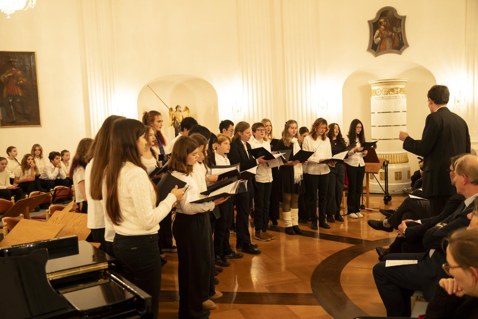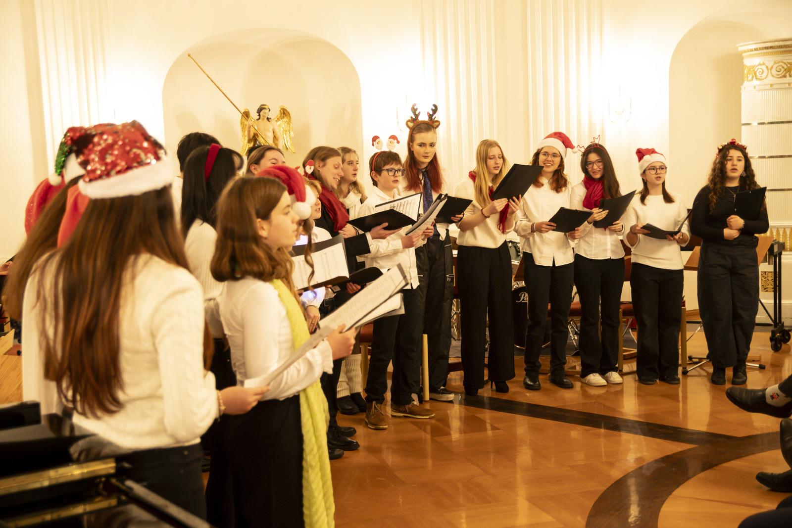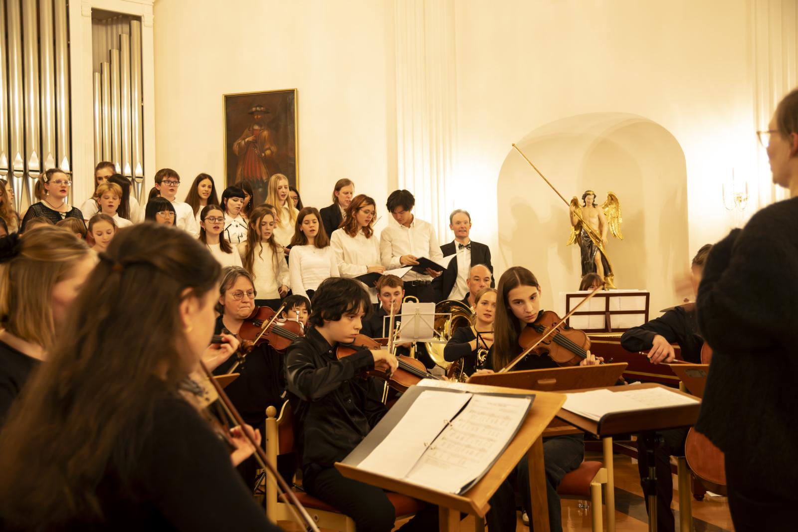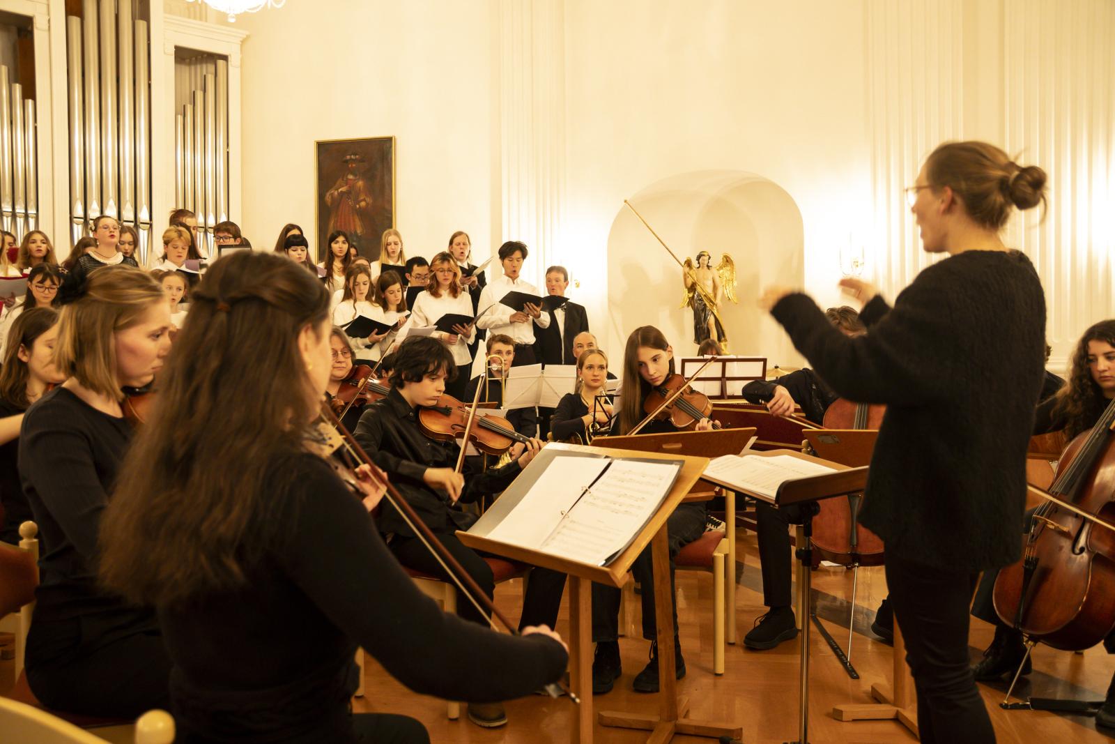 Am zweiten Adventswochenende erfüllte vorweihnachtliche Musik den Festsaal des Kollegs: Die traditionellen Adventskonzerte der Ensembles boten am Samstagabend und Sonntagnachmittag ein abwechslungsreiches Programm, das eindrucksvoll die Vielfalt der Musikkultur am Kolleg präsentierte. Unter der Leitung von Olaf Nießing (Orchester-AG), Maria Backhaus (Chor-AG), Florian Auls (Kollegs-Chor) und Viola Grömminger (Kollegs-Orchester) präsentierten Kollegianerinnen und Kollegianer ein musikalisches Konzertereignis aus geistlicher, klassischer, traditioneller und populärer Musik. Zum Konzertbeginn sorgten Bläser der Big Band (unter der Leitung von Klaus Weißenbach) für eine klangvolle Einstimmung im Foyer des Festsaals. Die Orchester-AG eröffnete das Programm mit der Kollegshymne „Ad majorem Dei gloriam“ und „Engel auf den Feldern“, bevor gemeinsam mit der Chor-AG erklang. Die Chor-AG präsentierte, von zwei Schülerinnen moderiert und immer wieder solistisch agierenden Sängerinnen und Sängern, zudem bekannte Werke wie „Maria durch ein Dornwald ging“. Der Kollegs-Chor spannte den Bogen von internationalen Weihnachtsliedern über traditionelle Carols bis hin zu Sting und modernen Klassikern. Darüber hinaus lag ein besonderer Akzent auf dem Zusammenspiel mit dem Kollegs-Orchester: Gemeinsam mit Unterstufenchor und Kollegschor erklang eine Auswahl aus der 2. Kantate - der Hirtenkantate - aus Bachs Weihnachtsoratorium, wobei Minqian Fang und Larissa Bienger die continuobegleiteten Rezitative (Maren Perkins und Taisia Böttcher) beisteuerten. Zum Abschluss sorgte das Orchester gemeinsam mit den Blechbläsern und Schlagwerkern der Big-Band für ein mitreißendes Medley aus dem Film The Polar Express und ein schwungvolles Ende des Konzerts. Der Ausklang gestaltete sich traditionsgemäß mit „Tochter Zion“ samt singendem Publikum und allen Mitwirkenden und Orgel.