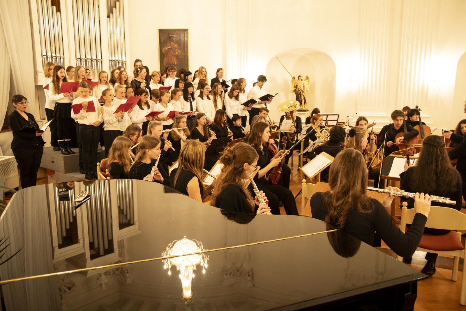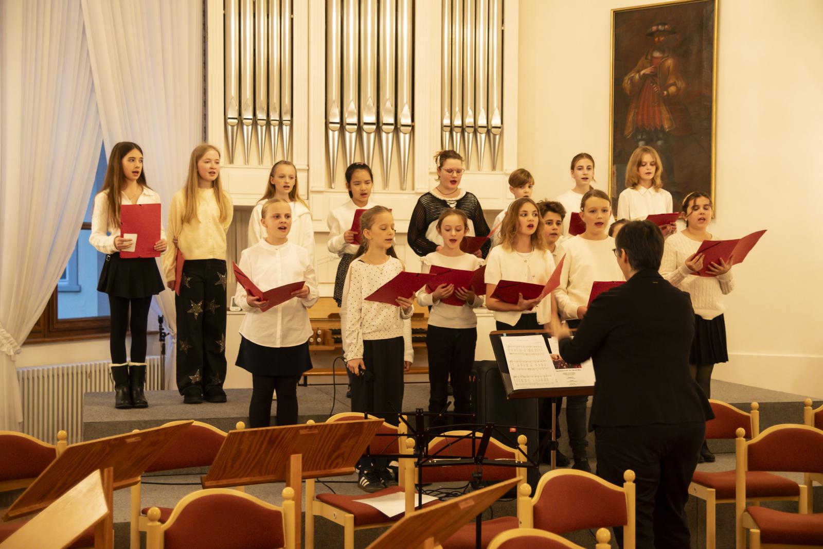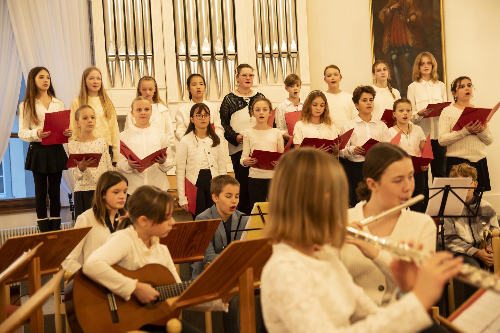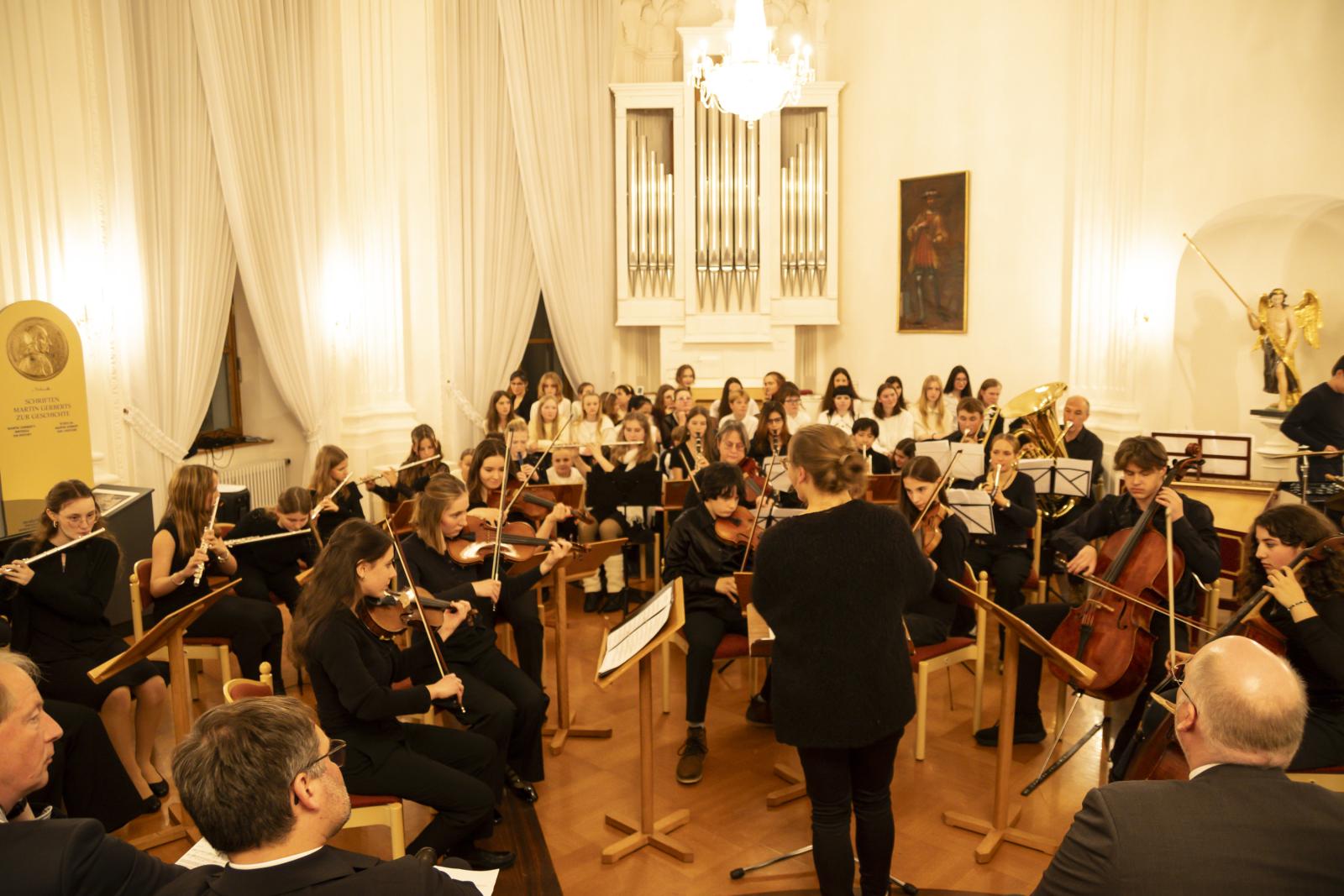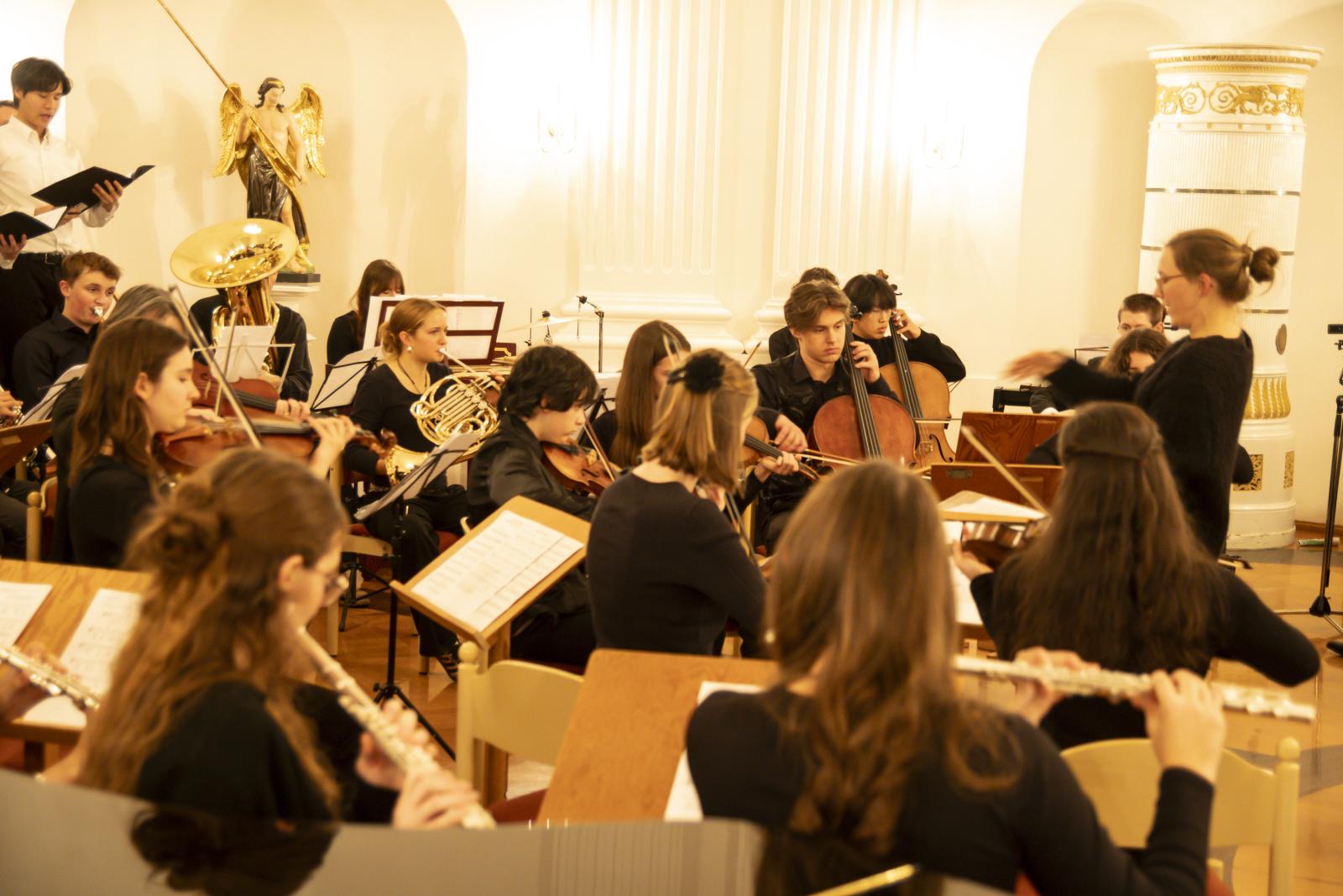 Am zweiten Adventswochenende erfüllte vorweihnachtliche Musik den Festsaal des Kollegs: Die traditionellen Adventskonzerte der Ensembles boten am Samstagabend und Sonntagnachmittag ein abwechslungsreiches Programm, das eindrucksvoll die Vielfalt der Musikkultur am Kolleg präsentierte. Unter der Leitung von Olaf Nießing (Orchester-AG), Maria Backhaus (Chor-AG), Florian Auls (Kollegs-Chor) und Viola Grömminger (Kollegs-Orchester) präsentierten Kollegianerinnen und Kollegianer ein musikalisches Konzertereignis aus geistlicher, klassischer, traditioneller und populärer Musik. Zum Konzertbeginn sorgten Bläser der Big Band (unter der Leitung von Klaus Weißenbach) für eine klangvolle Einstimmung im Foyer des Festsaals. Die Orchester-AG eröffnete das Programm mit der Kollegshymne „Ad majorem Dei gloriam“ und „Engel auf den Feldern“, bevor gemeinsam mit der Chor-AG erklang. Die Chor-AG präsentierte, von zwei Schülerinnen moderiert und immer wieder solistisch agierenden Sängerinnen und Sängern, zudem bekannte Werke wie „Maria durch ein Dornwald ging“. Der Kollegs-Chor spannte den Bogen von internationalen Weihnachtsliedern über traditionelle Carols bis hin zu Sting und modernen Klassikern. Darüber hinaus lag ein besonderer Akzent auf dem Zusammenspiel mit dem Kollegs-Orchester: Gemeinsam mit Unterstufenchor und Kollegschor erklang eine Auswahl aus der 2. Kantate - der Hirtenkantate - aus Bachs Weihnachtsoratorium, wobei Minqian Fang und Larissa Bienger die continuobegleiteten Rezitative (Maren Perkins und Taisia Böttcher) beisteuerten. Zum Abschluss sorgte das Orchester gemeinsam mit den Blechbläsern und Schlagwerkern der Big-Band für ein mitreißendes Medley aus dem Film The Polar Express und ein schwungvolles Ende des Konzerts. Der Ausklang gestaltete sich traditionsgemäß mit „Tochter Zion“ samt singendem Publikum und allen Mitwirkenden und Orgel.