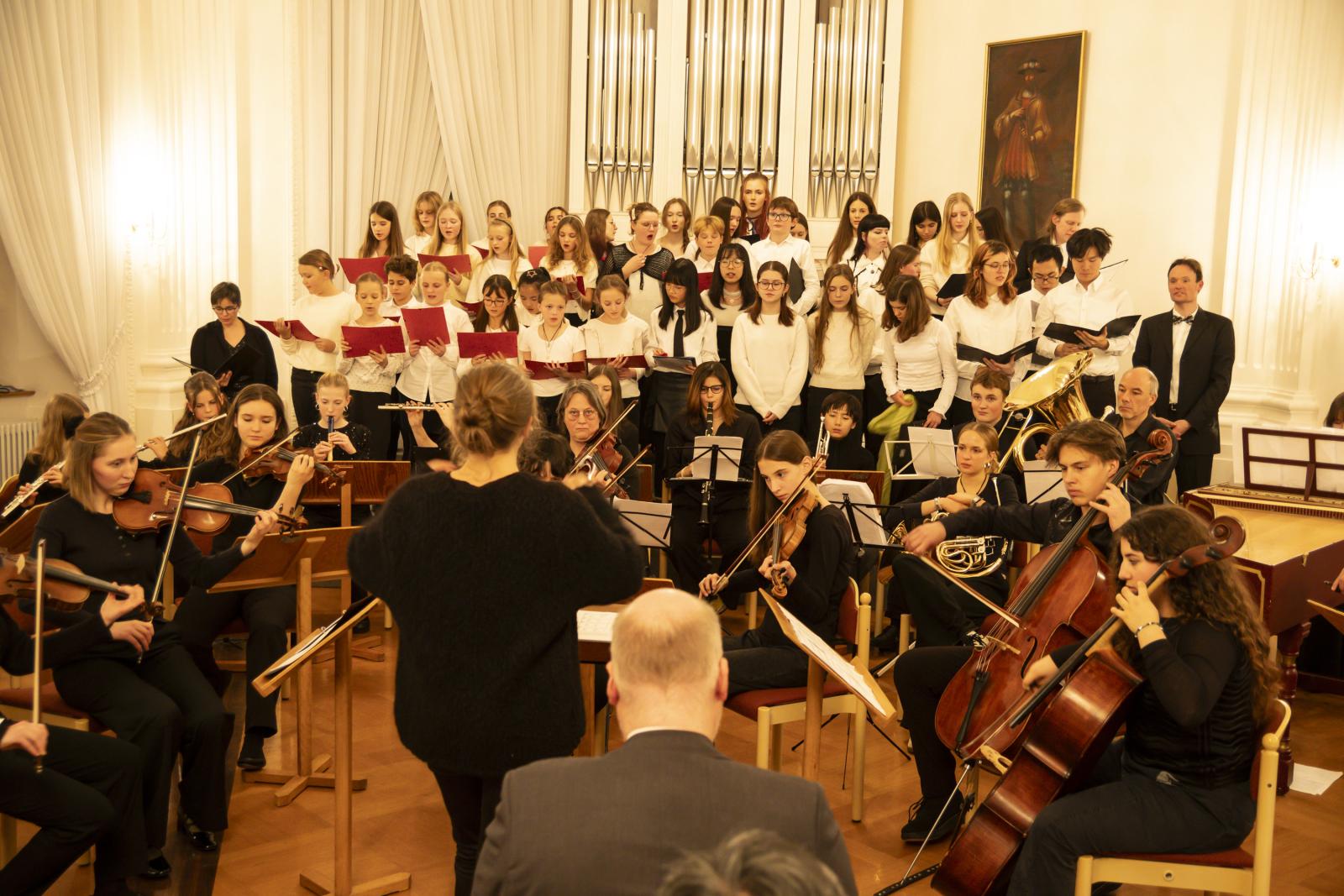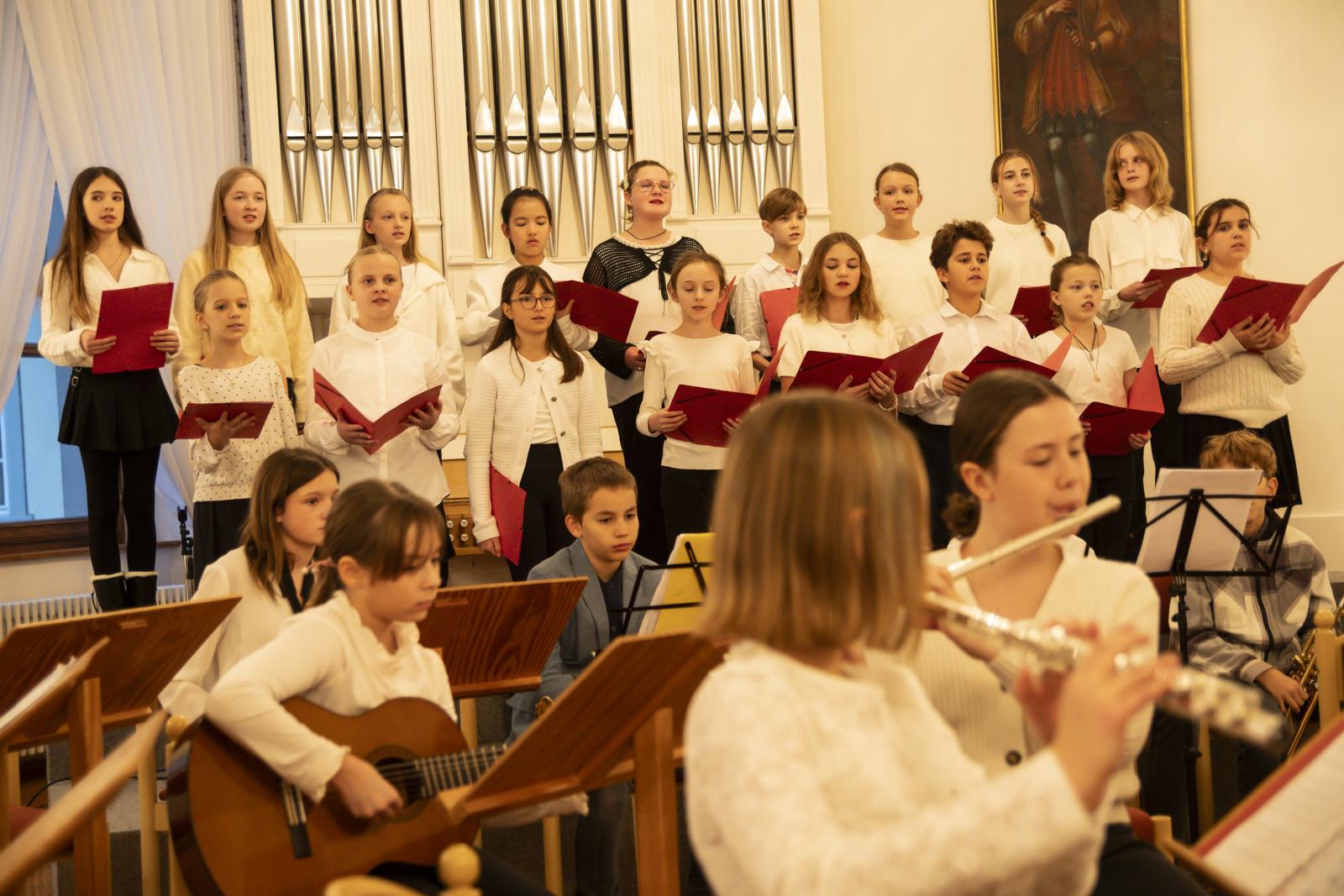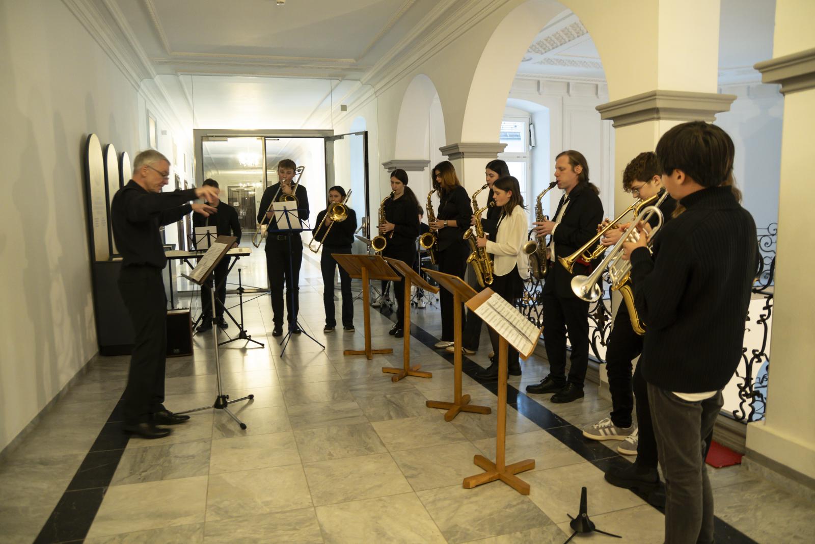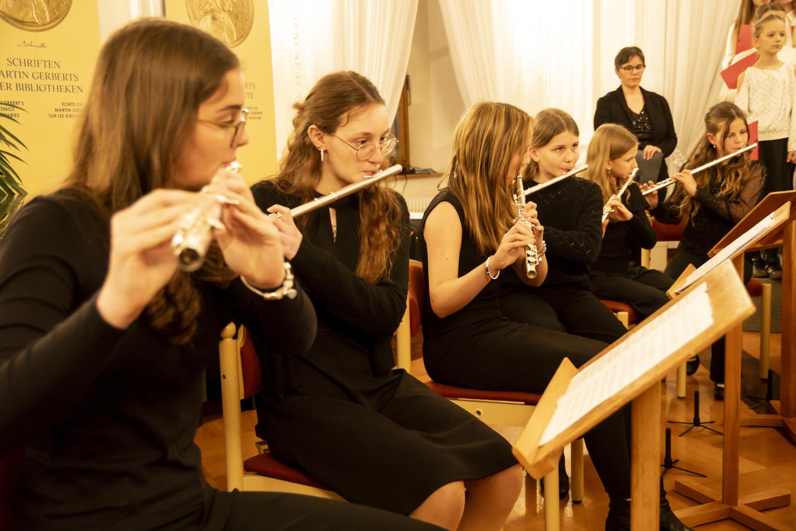 Am zweiten Adventswochenende erfüllte vorweihnachtliche Musik den Festsaal des Kollegs: Die traditionellen Adventskonzerte der Ensembles boten am Samstagabend und Sonntagnachmittag ein abwechslungsreiches Programm, das eindrucksvoll die Vielfalt der Musikkultur am Kolleg präsentierte. Unter der Leitung von Olaf Nießing (Orchester-AG), Maria Backhaus (Chor-AG), Florian Auls (Kollegs-Chor) und Viola Grömminger (Kollegs-Orchester) präsentierten Kollegianerinnen und Kollegianer ein musikalisches Konzertereignis aus geistlicher, klassischer, traditioneller und populärer Musik. Zum Konzertbeginn sorgten Bläser der Big Band (unter der Leitung von Klaus Weißenbach) für eine klangvolle Einstimmung im Foyer des Festsaals. Die Orchester-AG eröffnete das Programm mit der Kollegshymne „Ad majorem Dei gloriam“ und „Engel auf den Feldern“, bevor gemeinsam mit der Chor-AG erklang. Die Chor-AG präsentierte, von zwei Schülerinnen moderiert und immer wieder solistisch agierenden Sängerinnen und Sängern, zudem bekannte Werke wie „Maria durch ein Dornwald ging“. Der Kollegs-Chor spannte den Bogen von internationalen Weihnachtsliedern über traditionelle Carols bis hin zu Sting und modernen Klassikern. Darüber hinaus lag ein besonderer Akzent auf dem Zusammenspiel mit dem Kollegs-Orchester: Gemeinsam mit Unterstufenchor und Kollegschor erklang eine Auswahl aus der 2. Kantate - der Hirtenkantate - aus Bachs Weihnachtsoratorium, wobei Minqian Fang und Larissa Bienger die continuobegleiteten Rezitative (Maren Perkins und Taisia Böttcher) beisteuerten. Zum Abschluss sorgte das Orchester gemeinsam mit den Blechbläsern und Schlagwerkern der Big-Band für ein mitreißendes Medley aus dem Film The Polar Express und ein schwungvolles Ende des Konzerts. Der Ausklang gestaltete sich traditionsgemäß mit „Tochter Zion“ samt singendem Publikum und allen Mitwirkenden und Orgel.