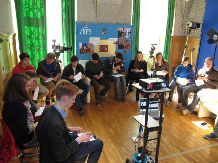 Am Donnerstagnachmittag (17.10.) führte das Kollegsfernsehen (KFS) eine Einführungsveranstaltung in die Filmgestaltung für interessierte Schülerinnen und Schüler durch. Ein Medienpädagoge vermittelte das grundlegende Basiswissen zum Themenfeld, beispielsweise die Umsetzung von Inhalten und dramaturgische Stilmittel verschiedener Genres wie Reportage und Dokumentar-Film. Praktische Übungen rundeten den gelungenen Film-Workshop ab. Das KFS gibt es bereits seit 1981 am Kolleg und war eines der ersten Schülerfernsehen in Deutschland. Mehrmals im Jahr produzierte das Kollegsfernsehen (KFS) eine Nachrichtensendung im Magazinformat und griff aktuelle Themen und Ereignisse rund um das Kollegsleben auf.