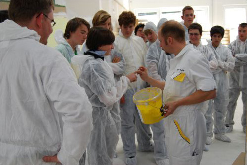 Das Kooperationsprojekt mit der Sto AG zur ästhetischen Aufwertung der Freizeiträume in zwei Internatsgruppen startete erfolgreich am vergangenen Donnerstag Nachmittag mit einer Werksbesichtigung der Sto AG in Stühlingen. Dabei fand für die Jugendlichen der Gruppen 4 und 5 eine Theorieschulung und Praxisübung statt. Mitarbeiter der Sto AG stellen bei diesem Vorhaben beeindruckend ihre Fachkenntnisse den Jugendlichen und großzügig Material unentgeltlich zur Verfügung. Am Freitag und Samstag erledigten die Jugendlichen die notwendigen Vorbereitungsarbeiten. In vielerlei Hinsicht gewinnen alle Beteiligten bei dieser Engagementpartnerschaft.