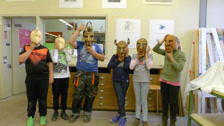 Am vergangenen Wochenende wurde in unserer Kunstwerkstatt erstmals der Workshop "Masken aus Holz" mit dem bekannten Holzbildhauer Simon Stiegeler aus Grafenhausen durchgeführt. Die sechs teilnehmenden Schülerinnen und Schüler entwarfen eigene Masken aus Plastilin, die sie anschließend unter fachkundiger Anleitung in weichem Lindenholz mit verschiedenen Schnitzmesser umsetzten.