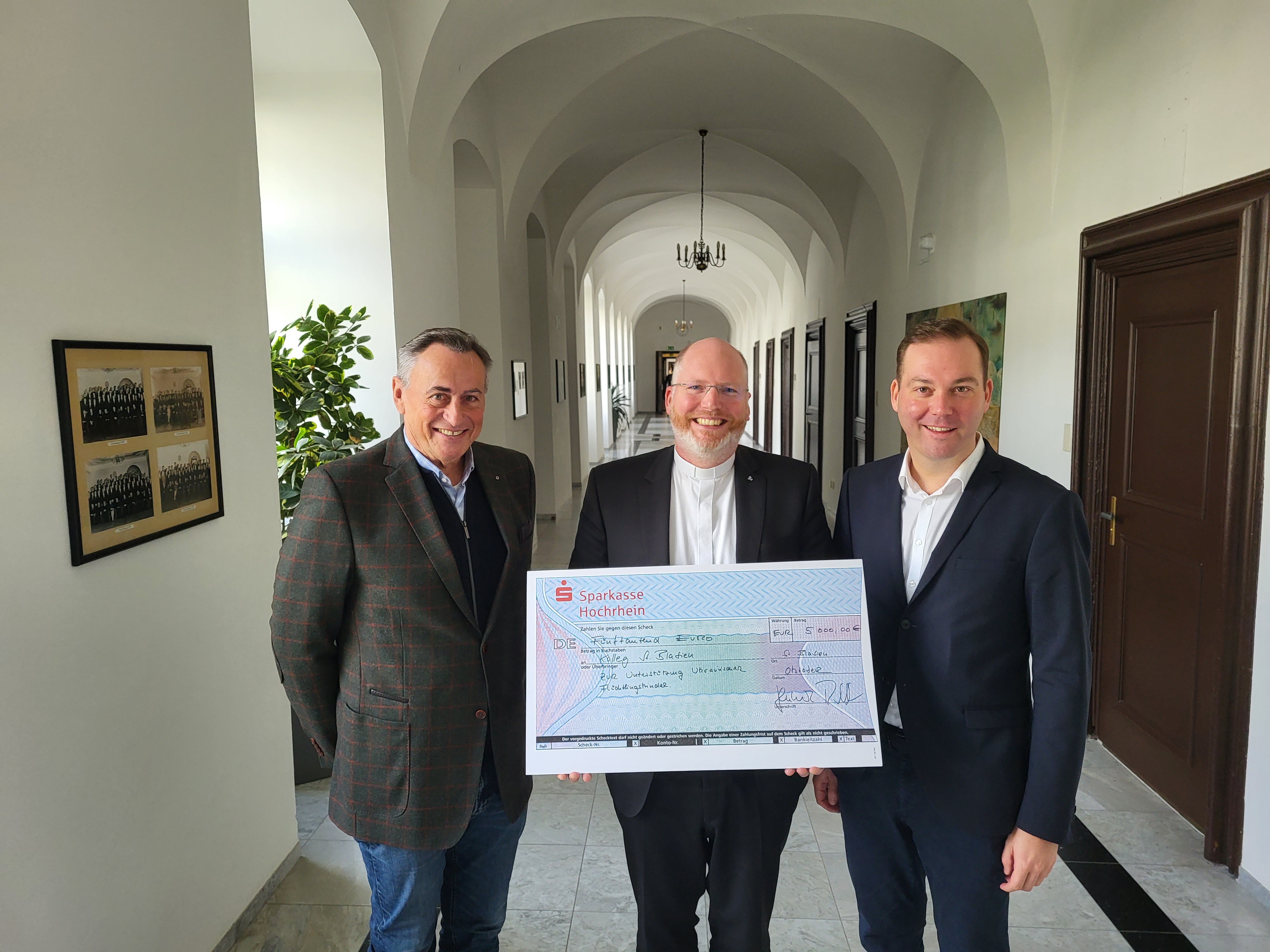 Altkollegianer Dr. Rolf Winterhalter vom Lions Club Waldshut überreichte am Dienstag (25.10.) gemeinsam mit dem Präsidenten Felix Schreiner einen Scheck über 5.000 € an Kollegsdirektor Pater Hans-Martin Rieder SJ. Rieder SJ freute sich über die großzügige Unterstützung durch den Lions Club Waldshut und dankte für die Ermöglichung, ukrainischen Flüchtlingskindern in ihrer Not am Kolleg St. Blasien helfen zu können. Ca.30 ukrainische Jugendliche sind aktuell in das normale Kollegssystem mit „Euro-Klasse“ und Gymnasialunterricht eingefädelt. Da aber immer mehr Familien in der Raumschaft St. Blasien ankommen, wird das Kolleg St. Blasien erneut eine spezielle Willkommensklasse für ukrainische Flüchtlinge einrichten. Im Zentrum steht die Vermittlung von Deutschkenntnissen. Diese Klasse erhält ihr eigenes Programm und wird von Montag bis Freitag unterrichtet. „Damit wird den geflüchteten Jugendlichen eine Struktur und einen Ort angeboten, wo sie sich wohl und sicher fühlen und zudem erste Kenntnisse in Deutsch erwerben können“, so Pater Rieder SJ. „Das Land Ukraine erlebt gerade einen Albtraum. Wenn Menschen in Not sind, müssen wir helfen. Die Jugendlichen finden hier vor Ort eine ideale Unterstützung“, sagte der Bundestagsabgeordnete.