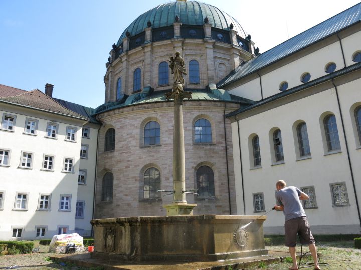 In diesen Tagen wird der schöne Marienbrunnen im Abteihof restauriert, um ihn in neuem Glanz erstrahlen zu lassen. Er ist inzwischen durch Wind und Wetter ergraut und benötigt eine Grundreinigung und Spezialbehandlung. Das Kolleg bedankt sich für das großzügige Engagement eines Wohltäters bei der Sanierung des Marienbrunnens. Den Brunnentrog zieren die Wappen Fürstabt Martin Gerberts (Westseite) und das Familienwappen der Familie Hackelsberger aus Öflingen. Die anderen Seiten tragen das Jesuitenwappen und das Monogramm Mariens. Auf dem korinthischen Kapitell der Brunnensäule steht die Himmelskönigin mit Sternenkranz und Szepter, das Königskind in den Armen, die Patronin des Kollegs.