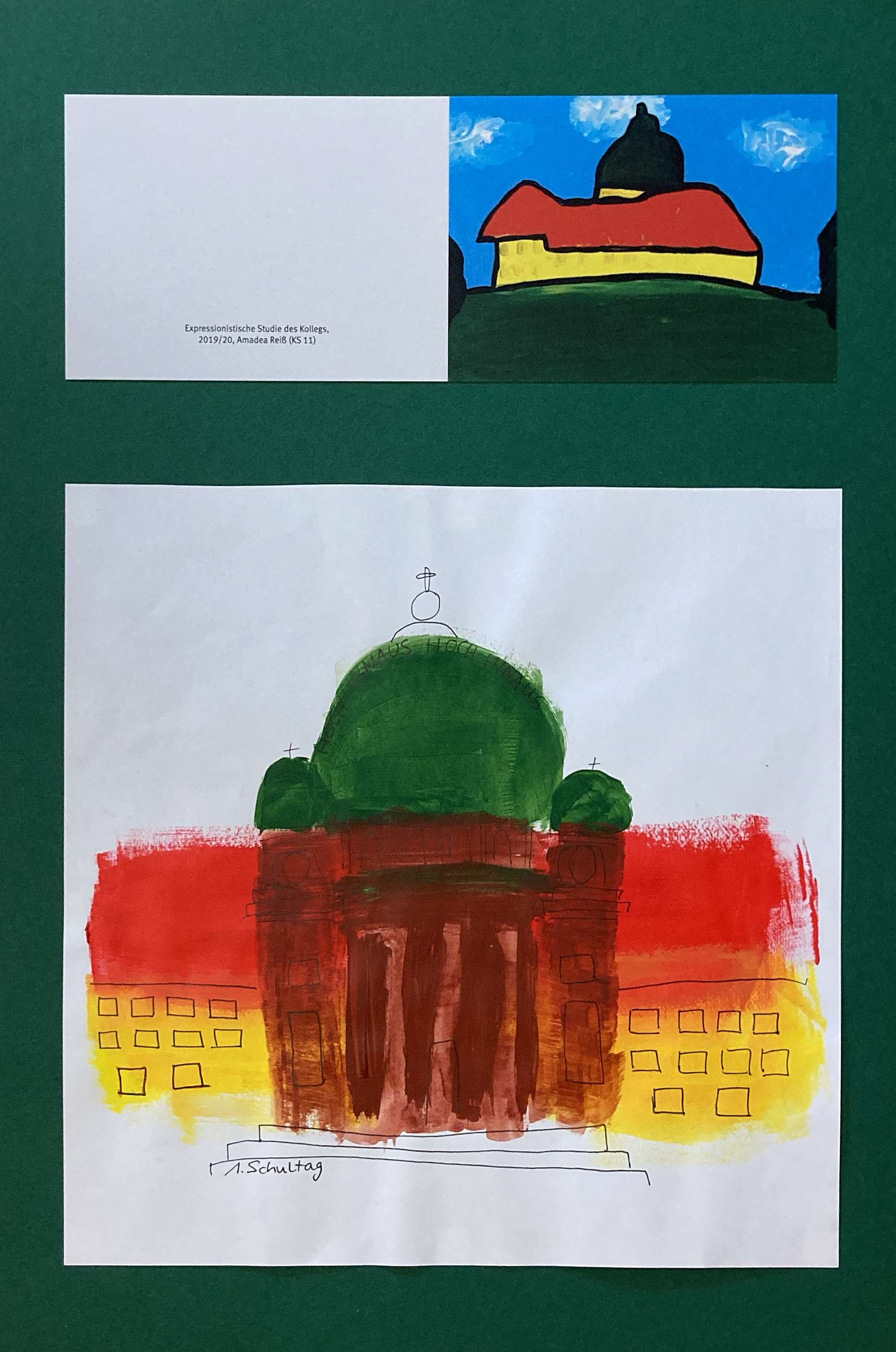 „Mein Leben am Kolleg“, so heißt der Titel der Ausstellung von Amadea Reiß (KS 12) in der Pforte des Kollegs. Einzelne Arbeiten der 20-jährigen Münchnerin werden dort gegenwärtig präsentiert, die für ihre Kunstmappe entstanden sind. Nach ihrem Abitur am Kolleg wird sie im Herbst ein Design-Studium in Freiburg aufnehmen. Im KFS-Interview spricht Amadea über ihre Kollegszeit und Kunstwerke. Sie selbst sagt: „Drei Jahre durfte ich hier am Kolleg leben und lernen, dies ist eine Zeit, die ich niemals vergessen werde. Jeder Moment und jede Begegnung hat mich hier in der Schule und im Internatsleben geprägt. Ich durfte frei wählen, wie ich meine Mappe für die Aufnahme zum Studium gestalte. Das Kolleg ist mein Zuhause und zu meiner Heimat geworden. Mit der Mappe wollte ich ausdrücken, wie ich mich in diesen Jahren gefühlt habe. Was es heißt in einer Gemeinschaft zu leben: Vielfalt, Glauben, Stärke, Zusammenhalt, ... all diese Sachen und noch viel mehr, darf man hier erleben. Der Dom hat mich fasziniert und die Stadt Sankt Blasien verzaubert. Mit dieser Mappe werde ich meine Zeit hier beenden und mich bei allen bedanken, die mich auf meinem Weg begleitet haben. Hier zu leben ist ein Geschenk! Vielen Dank an ALLE!!"