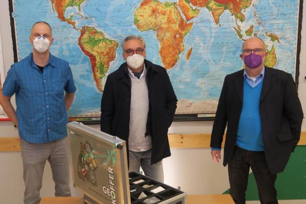 Die Fachschaft Erdkunde am Kolleg besitzt nun den multimedialen Geo-Koffer, der dem Geographie-Unterricht einen praktischen Mehrwert verleiht. Altkollegianer Jens Albiez (Abi 1986) machte den Geo-Koffer dem Kolleg zum Geschenk, gespendet von der Albiez Creativ- & Designbau GmbH & Co. KG in Waldshut-Tiengen. Für das Kolleg freute sich Schulleiter Michael Becker und Fachschaftsleiter Matthias Schopp über den begehrten Geo-Koffer. Neben einer besonderen Sammlung von handgeschliffenen Steinen zum Experimentieren und Anfassen enthält der schwergewichtige Koffer auch digitale Lehrmittel, beispielsweise Filme, Präsentationen und Schautafeln. So können den Schülerinnen und Schülern auch mit bewegten Bildern der Weg der Gesteine von ihrer Entstehung bis hin zu ihrer Verwendung als Baustoff eindrücklich erläutert werden.