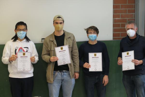 "Die Fähigkeit zur Zusammenarbeit ist ein ganz zentraler Wert unseres Lebens" so das Motto des Mathematik-Teamwettbewerbs „Bolyai”. Beim diesjährigen Wettbewerb hat sich unser V-Team des Vertiefungskurs Mathematik der KS 12 mit einem erfolgreichen 3. Platz belohnen können. So konnten sich Alexander Hodson, Mostafa Heydari, Yu Cheng Fang und Luekar Herke über ihre sehr schöne Auszeichnung freuen, bei welcher sie neben ihrer Urkunde jeweils ein T-Shirt und ein Knobelspiel als Preis überreicht bekamen. Wir gratulieren diesen vier Schülern herzlich zu ihrem tollen Erfolg! Die Ehrung und Preisübergabe für das erfolgreiche V-Team fand im Rahmen ihres gemeinsamen Physikunterrichts durch Dr. Clemens Janz statt, der die Betreuung übernommen hatte. Auch ihm gilt unser herzlicher Dank.