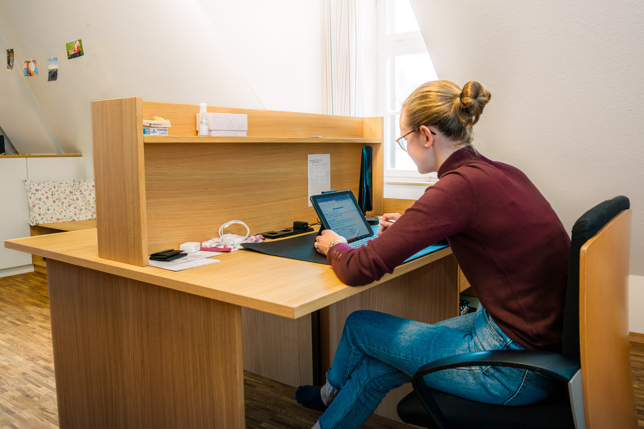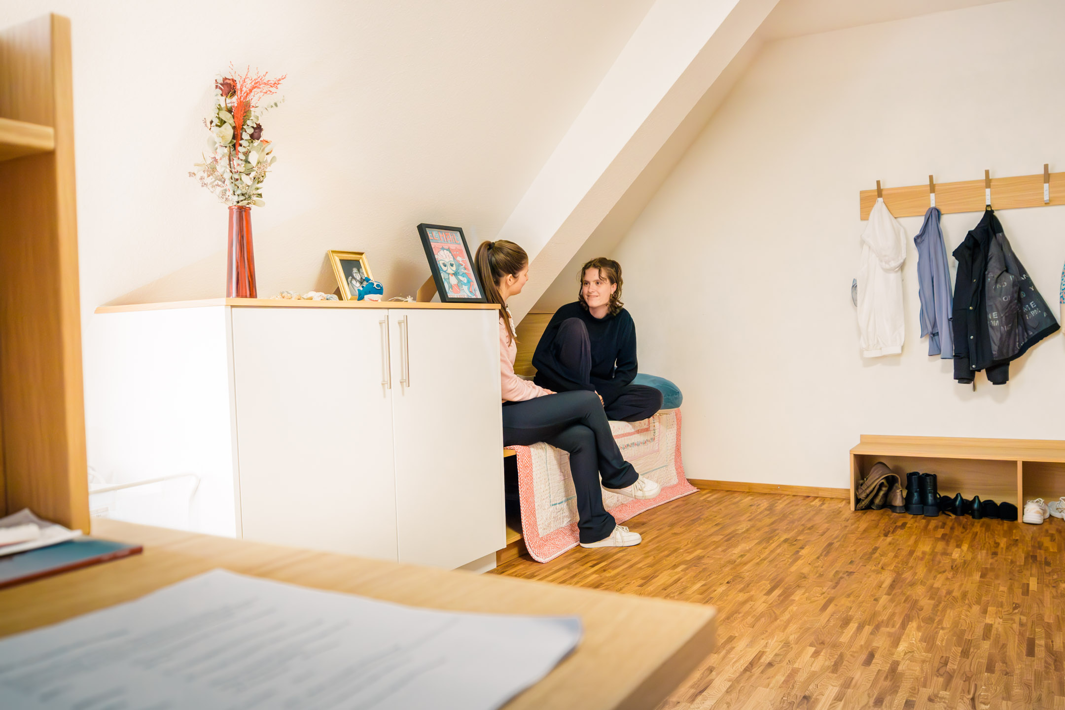 Mit einer Segensfeier wurde Mitte Oktober das generalsanierte dritte Obergeschoss in der „Mühle“ feierlich eingeweiht. Die umfangreich renovierten Zimmer im Mädcheninternat sind für die Schülerinnen der Klassenstufe 12 und bieten nun ein hohes Maß an Komfort und Qualität. Internatsleiter Pater Marco Hubrig SJ zeigte sich begeistert von den neuen Räumlichkeiten: „Echt tolle Zimmer,“ sagte er und hob dabei die hochwertige Ausstattung hervor. Die renovierten Zimmer sind mit Parkettfußböden aus Echtholz und maßgefertigten Einbaumöbeln aus Vollholz ausgestattet. Kollegsdirektor P. Hans Martin Rieder SJ segnete die schönen Internatszimmer in der Mühle. Darüber hinaus galt sein ganz besonderer Dank allen mitarbeitenden Firmen.