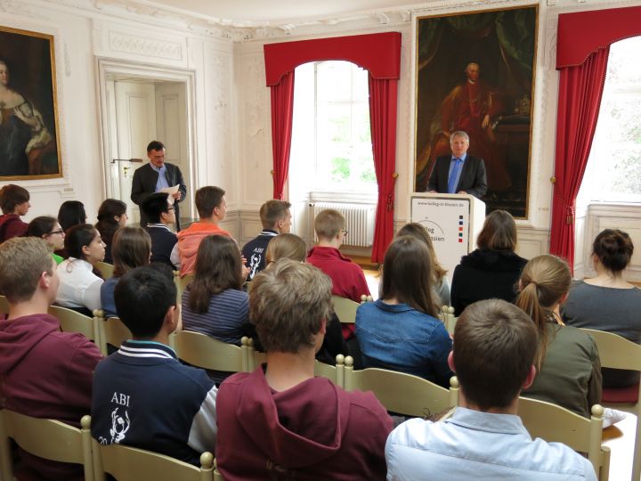 Unter dem Vorsitz von Herrn OStD Franz-Jürgen Zeiser vom Marie-Curie-Gymnasium Kirchzarten, der mit seiner Prüfungskommission vom Montag (26. Mai) bis zum Mittwoch (28. Mai) am Kolleg ist, finden die mündlichen Prüfungen für 109 Abiturienten am Kolleg statt. Die Abiturientia 2014 wurde am Montagnachmittag (26. Mai) vor Beginn der Prüfungen im Habsburger Saal versammelt und vom Prüfungsvorsitzenden begrüßt. Direkt im Anschluss begannen die 115 mündlichen Prüfungen im 30-Minuten-Rhythmus.