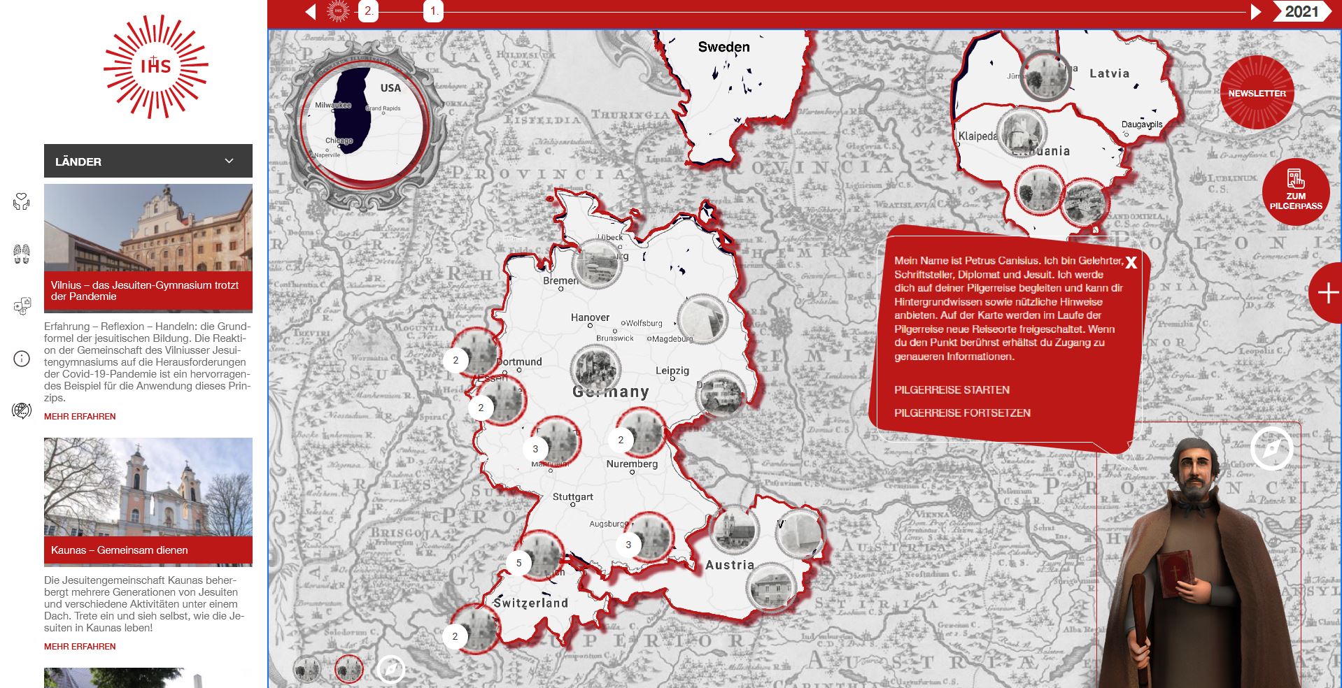 Die 33 Stationen auf dem Canisusweg führen von Vilnius in Litauen bis nach Fribourg in der Schweiz und durch alle Länder der neuen Provinz, zu der auch Standorte in Schweden und in Chicago/USA gehören. „In Riga zum Beispiel erfahren wir, welche Bedeutung die ignatianischen Exerzitien für die Ökumene haben. In Hamburg begegnen wir einem Jesuiten, der ein begeisterter Schlagzeuger ist.“ Die User können in das Leben, die Arbeit und Spiritualität der Jesuiten vor Ort eintauchen und erfahren, was es bedeutet, Gott in allen Dingen zu suchen und zu finden. „An jeder Station ist eine kleine Aufgabe zu lösen, um den Stempel für unseren digitalen Pilgerpass zu erhalten. Die Pilgerreise kann aber auch ein Weg sein, zu sich selber und zu Gott sein,“ erklärt Pia Dyckmans, Öffentlichkeitsreferentin der Jesuiten. „Der Pilger-Pass ist nicht nur eine Gaming-App, sondern setzt ganz bewusst geistliche Impulse und beinhaltet zudem eine persönliche Gebetsecke, dort kann der eigens dafür eingerichtete spirituelle Akku im Laufe des Pilgerwegs aufgefüllt werden.“