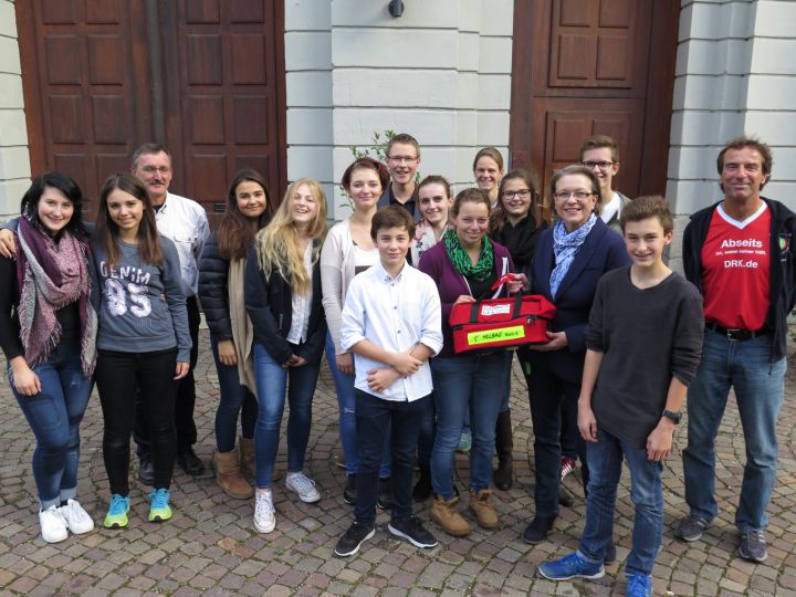 Die mit Anfang des Schuljahres neu angebotene Schulsanitäter AG findet regen Zuspruch. Initiiert wurde die Gründung von den Schülern Fabian Zorn und Thilo Maier, begleitet wird die Gruppe von den Lehrerinnen Frau Ostermann und Frau Campos. Unterstützung findet die neue AG dabei beim Kreis- und Ortsverband des Deutschen Roten Kreuzes sowie bei der Krankenkasse Barmer GEK, die den Schulsanitätern jetzt eine Materialtasche gespendet hat. Die Gruppe solle eine Lücke schließen, erläuterte Schulleiter Dr. Müller. Die Mitglieder der AG werden sozusagen als Minirettungsdienst eingesetzt. Sie werden also erste Hilfe leisten und einen verletzten Schüler zur Krankenstation des Kollegs oder aber zum herbeigerufenen Rettungswagen begleiten.