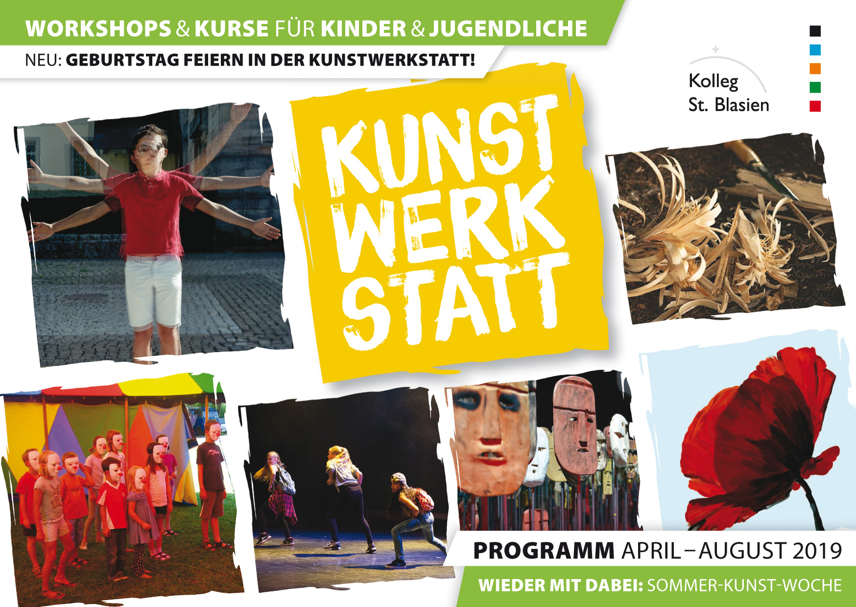 Mit vielseitigen 39 Programmangeboten, vermittelt von Profi-Kursleiterinnen und Kursleitern, ist Kindern und Jugendlichen aus dem Kolleg und der Region wieder einiges in unserer Kunstwerkstatt geboten. Eine breite Vielfalt von kreativen Erfahrungsfeldern und künstlerischen Entfaltungsmöglichkeiten. Neben bewährten Kursen bietet die Kunstwerkstatt wieder spannende neue Workshops an, z.B. Clownerie, Kalligrafie und experimentelles Arbeiten. Für handfeste Angebote sorgen das Schnitzen, Töpfern und Steinhauen. Zudem findet auch dieses Jahr wieder eine vielfältige Sommer-Kunst-Woche statt. Weitere Infos zum Kursprogramm und zur Anmeldung gibt es auf der Kunstwerkstatt-Internetpräsenz.