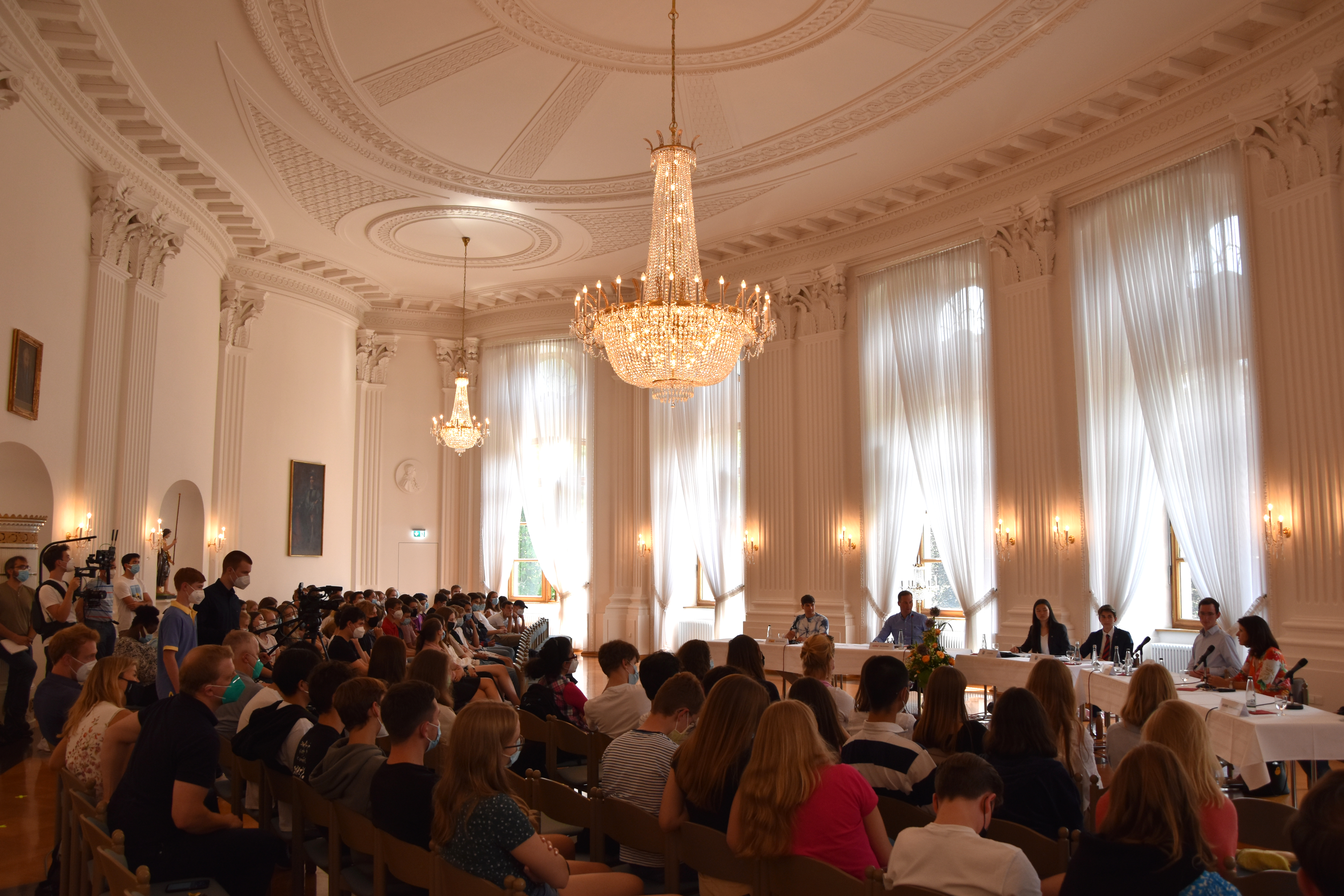 Die Fachschaft Gemeinschaftskunde des Kollegs hatte am Montagnachmittag (19. Juli) die Bundestagskandidaten von CDU, SPD, Grüne, FDP und Die Linke zur Podiumsdiskussion in den Festsaal eingeladen. Felix Schreiner (CDU), Rita Schwarzelühr-Sutter (SPD), Lukas Schmitt (Grüne), Jareem Khawaja (FDP) und Robert Kuhlmann (Linke) machten dabei ihre Positionen in den Themenfeldern Jugend und Politik, Bildung, Digitalisierung, Corona und Umwelt klar. Nach der moderierten Diskussionsrunde von Linh-Chi Bui und Philipp Kaiser hatten die Zehntklässler die Gelegenheit, ihre Fragen zu stellen und ins Gespräch zu kommen. Interessierte konnten die hybride Veranstaltung via Livestream des Kollegsfernsehen (KFS) verfolgen.