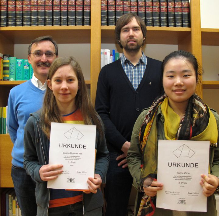 Beim 26. Landeswettbewerb Mathematik 2012/13 hat Yuzhu Zhou (Kl. 10e, Jiangyin/China) erneut einen 2. Preis und Sophia Hirt(Kl. 9b, Lenzkirch) wiederholt einen 3. Preis erzielt. Schulleiter Dr. Müller überreichte mit dem Mathematiklehrer Andreas Bröde die Urkunden den beiden Preisträgerinnen, die den sehr schönen Erfolg aus dem vergangenen Schuljahr wiederholen konnten. Er gratulierte und sprach ihnen seine Anerkennung für diese überdurchschnittliche Leistung aus. Es wurden mehrere Schulmathematik-Aufgaben aus den klassischen Gebieten Geometrie, Algebra und Zahlentheorie gestellt. Hunderte Schülerinnen und Schüler aus Realschulen und Gymnasien haben beim diesjährigen Landeswettbewerb Mathematik für die Mittelstufe teilgenommen.