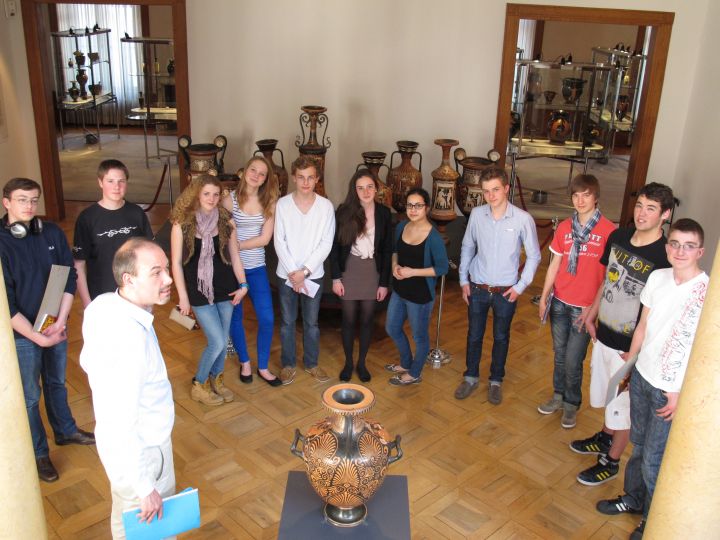 Am Freitagnachmittag begann die Griechisch-Klasse 9a von Herrn Raphael Michel ihre Exkursion in einem ungewohnten Ort. Sie führten das Projekt „Archäologen-Kongress“ im Antikenmuseum Basel durch. Nach einer Einführung in die Sonderausstellung wurden die elf Schülerinnen und Schüler in drei Kleingruppen eingeteilt, um die reichhaltigen Vasenbilder in den drei Kategorien Rausch im Mythos, Rausch im Alltag und Rausch im Kult zu begutachten. Im Anschluss präsentierten die Teams ihre Analysen im Plenum und organisierten eine Führung von Schülern für Schüler an einzelnen Stationen. Ziel war es, den Schüler die Alltagskultur in der griechischen Antike näher zu bringen und die Parallelen zu der heutigen Gesellschaft zu erschließen. Impressionen gibt es in der Bildergalerie.