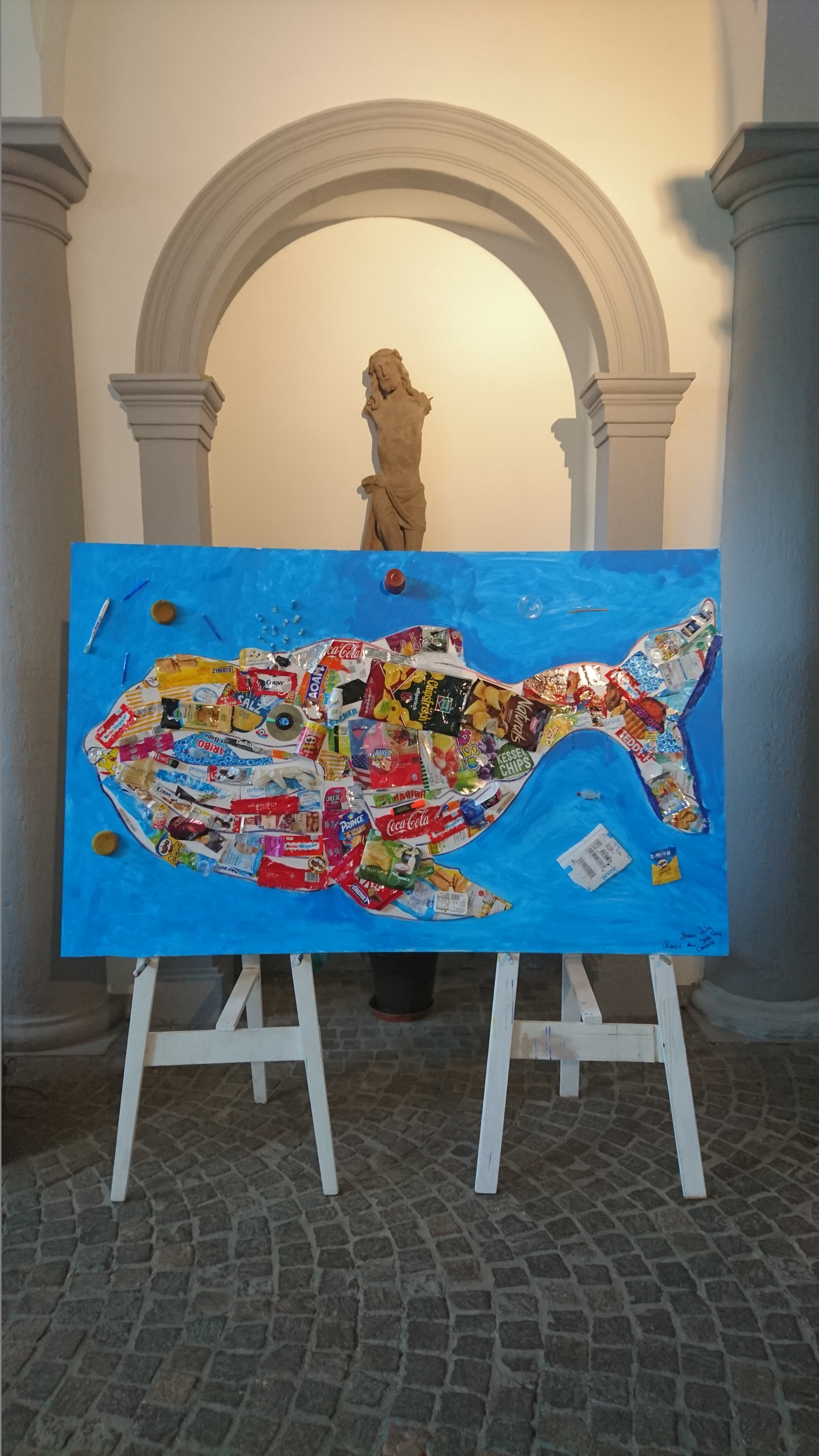 „Überall Plastik“ unter diesem Titel hat sich die Internatsgemeinschaft am vergangenen Samstag in zehn Workshops informiert, darüber reflektiert und künstlerisch damit auseinander gesetzt. Zwei lokale Entsorger haben den Schülerinnen und Schülern interessante Einblicke gegeben. Es ist klar geworden, dass der Müll immer noch falsch getrennt wird und dass Müllvermeidung der beste Weg ist. Spätestens seit den Demonstrationen „Fridays for Future“ brennt den Jugendlichen das Thema auf den Nägeln. Am Sonntagvormittag brachte P. Mertes SJ das Thema Müll und Plastik in den größeren Kontext unserer Verantwortung als Christen und Menschen. Dabei ging er auch auf die Tiere des Meeres ein, die im Plastikmüll verenden. Symbolischer dafür stand ein Wal, der am Samstag von Schülerinnen und Schülern aus Verpackungsmaterial gestaltet worden ist.