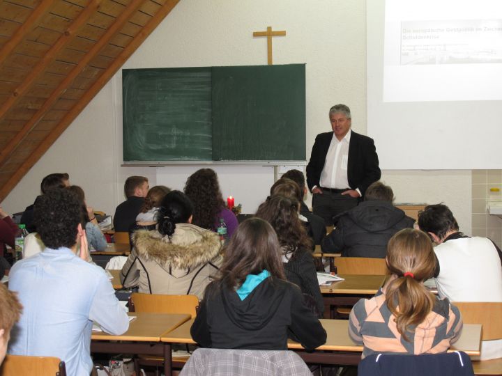 „Die aktuelle Finanzlage und die Schuldenkrise in Europa“ – zu diesem Thema fand am Montagvormittag (02.12.) ein Vortrag am Kolleg statt. Dr. Jürgen Hirsch von der Hauptverwaltung Stuttgart der Deutschen Bundesbank erläuterte die Grundlagen der europäischen Geldpolitik und die aktuellen Fehlentwicklungen in der Schuldenkrise. Der sachkundige Referent vermochte es, den Abiturientinnen und Abiturienten des Wirtschaftsleistungskurses die komplexen Zusammenhänge und Auswirkungen der europäischen Schuldenkrise anschaulich zu erklären.
