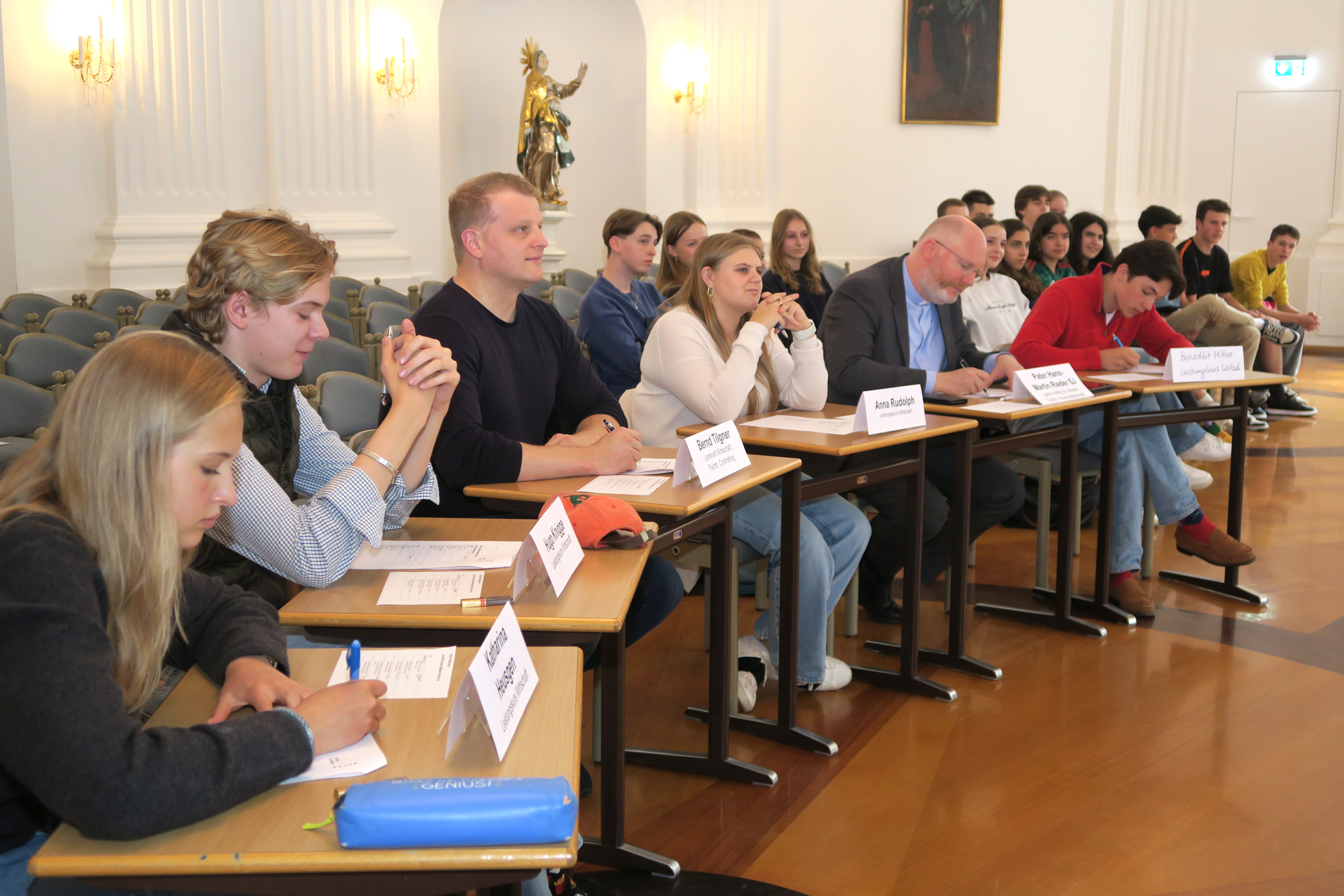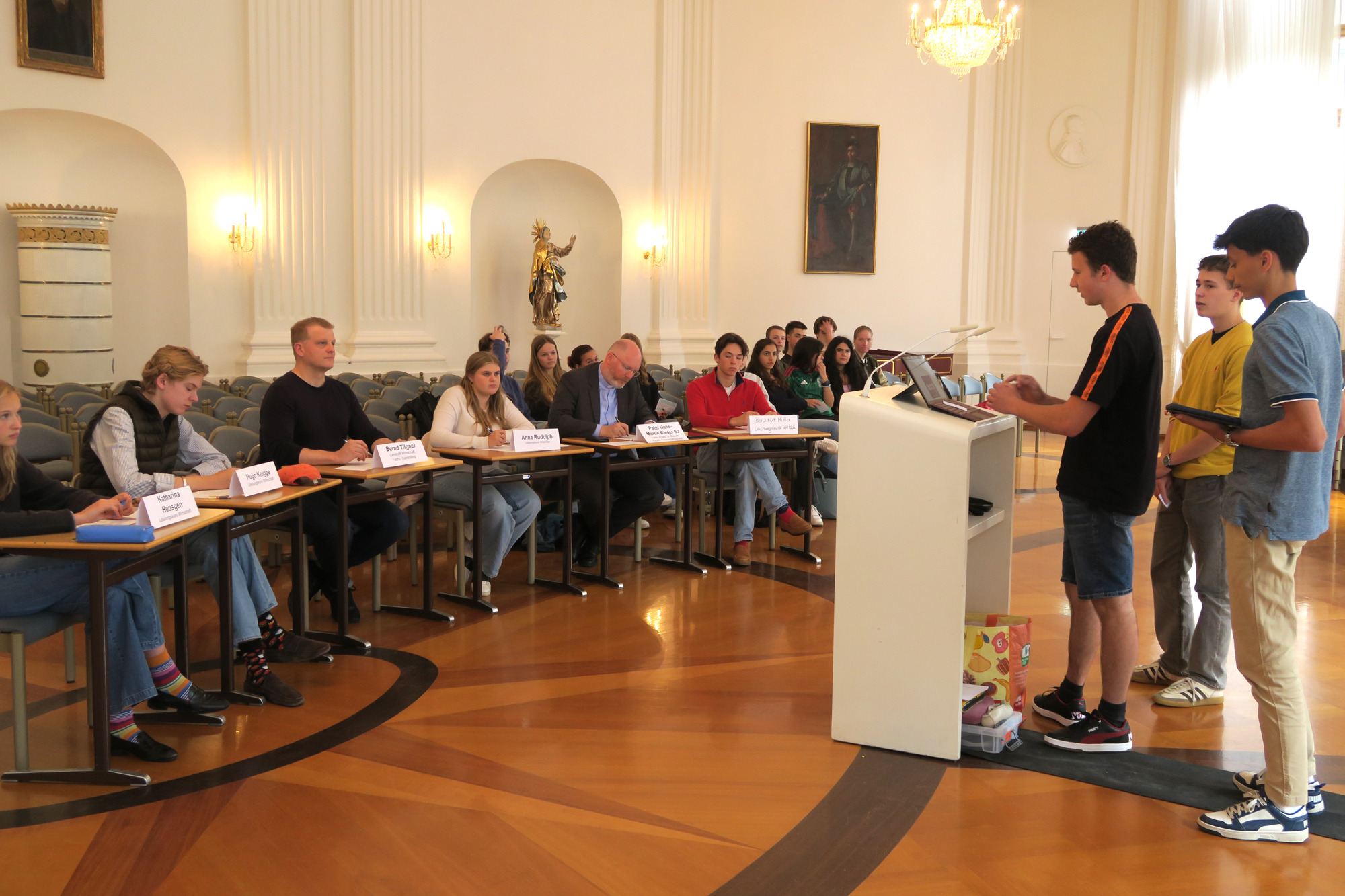 Nach wochenlanger Erarbeitung der Ideen und Businesspläne präsentierte die Klasse 10e am vergangenen Donnerstag (4. Juli) im Festsaal ihre Ideen. Die Jury hatte die Qual der Wahl von technischem Support für Computer und Handy für ältere Mitmenschen, über Apps, die dabei unterstützt auf Social Media zu verzichten und Menschen für gemeinsamen Sport zu begeistern, bis hin zu Seifenspendern, in denen dank ihrer kegelförmigen Flaschen kein Rest Seife übrig bleibt.