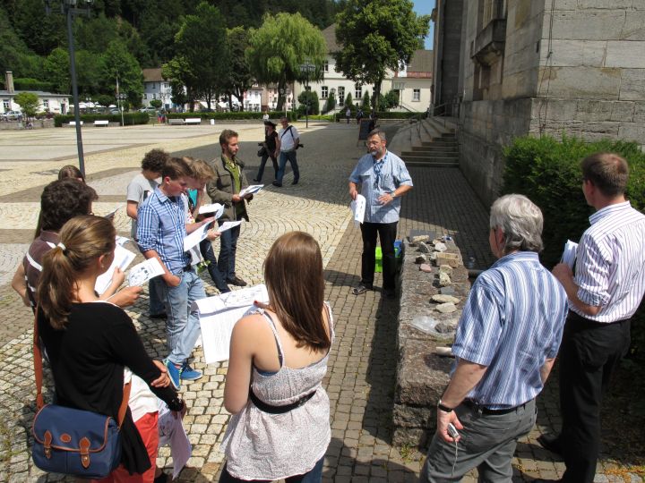 Gegenwärtig wird vom Landesamt für Geologie Baden-Württemberg eine Publikation mit dem Titel "Naturwerksteine in Baden-Württemberg - Vorkommen, Beschaffenheit und Nutzung" erarbeitet. Ein Kapitel befasst sich mit der Verwendung der Sandsteine als Bau- und Ornamentstein. Ein herausragendes Beispiel ist der St. Blasier Dom. Die Sandsteinblöcke wurden in mehreren Steinbrüchen westlich von Unteralpfen gebrochen. Vor diesem Hintergrund nahmen die Schüler des Geologie-Kurses von Herrn Salzmann am Freitagnachmittag die im Dom verbauten Sandsteine etwas genauer unter die Lupe. Die kurzweilige Doppelstunde unter der fachkundigen Leitung von Herrn Dr. Helmut Bock (Freiburg) war in mehrfacher Hinsicht sehr interessant, da am Dom viele Beobachtungen zum Transport und zur Ablagerung der Sandsteine zu machen sind.