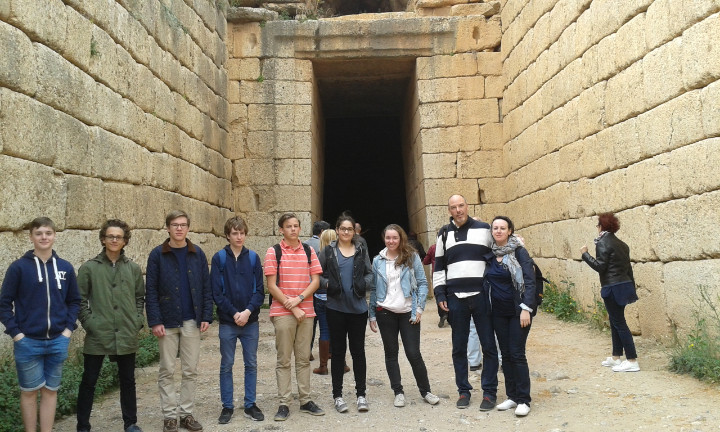 Die Griechisch-Schüler der 10. Klasse befanden in den Osterferien unter der Leitung von Herrn Michel und seiner Frau auf einer Rundreise auf der Peloponnes. Dabei konnten die Schüler endlich die klassischen Stätten wie Akropolis, Delphi, Olympia und Mykene mit eigenen Augen sehen und gleichzeitig den nach Orangenblüten duftenden, griechischen Frühling genießen.