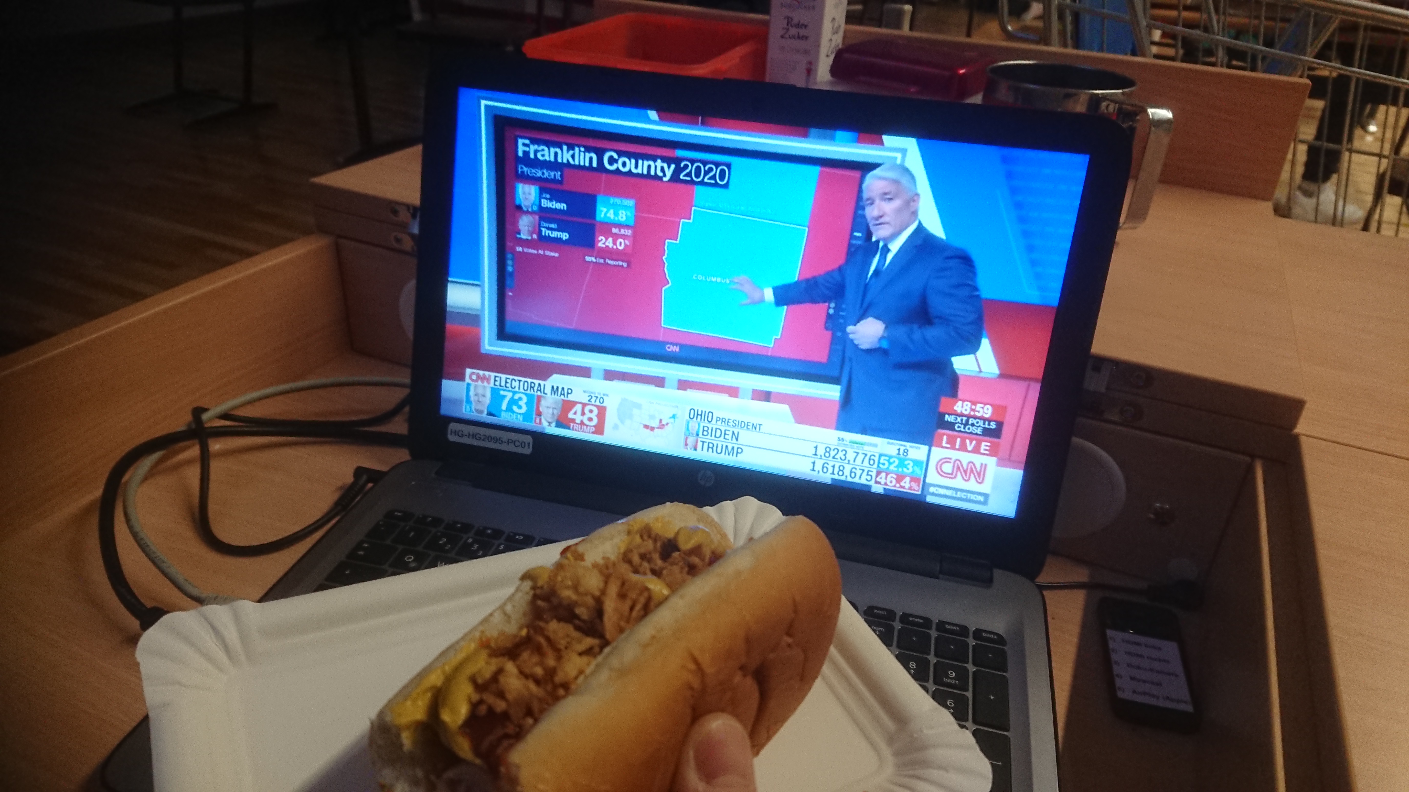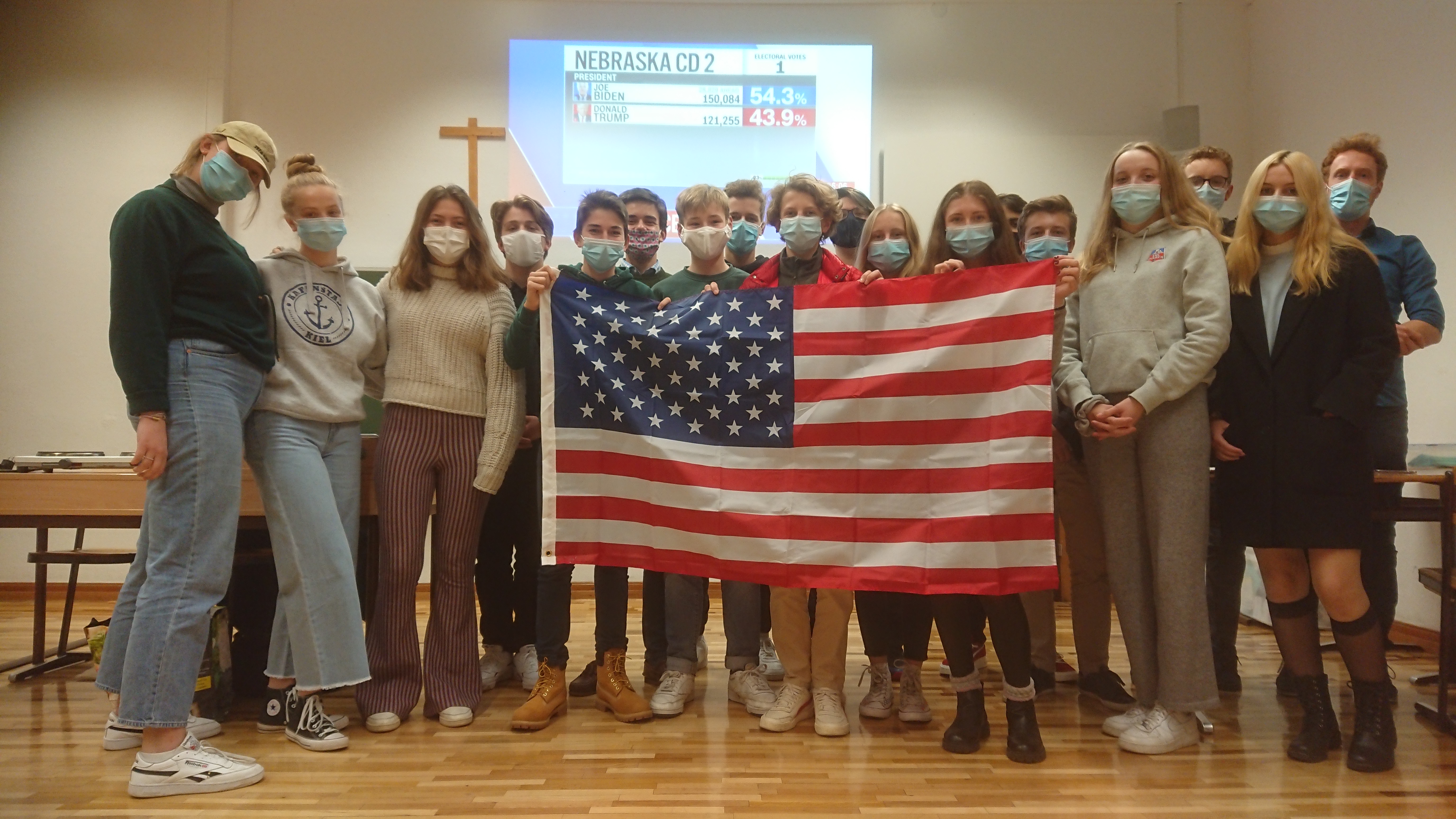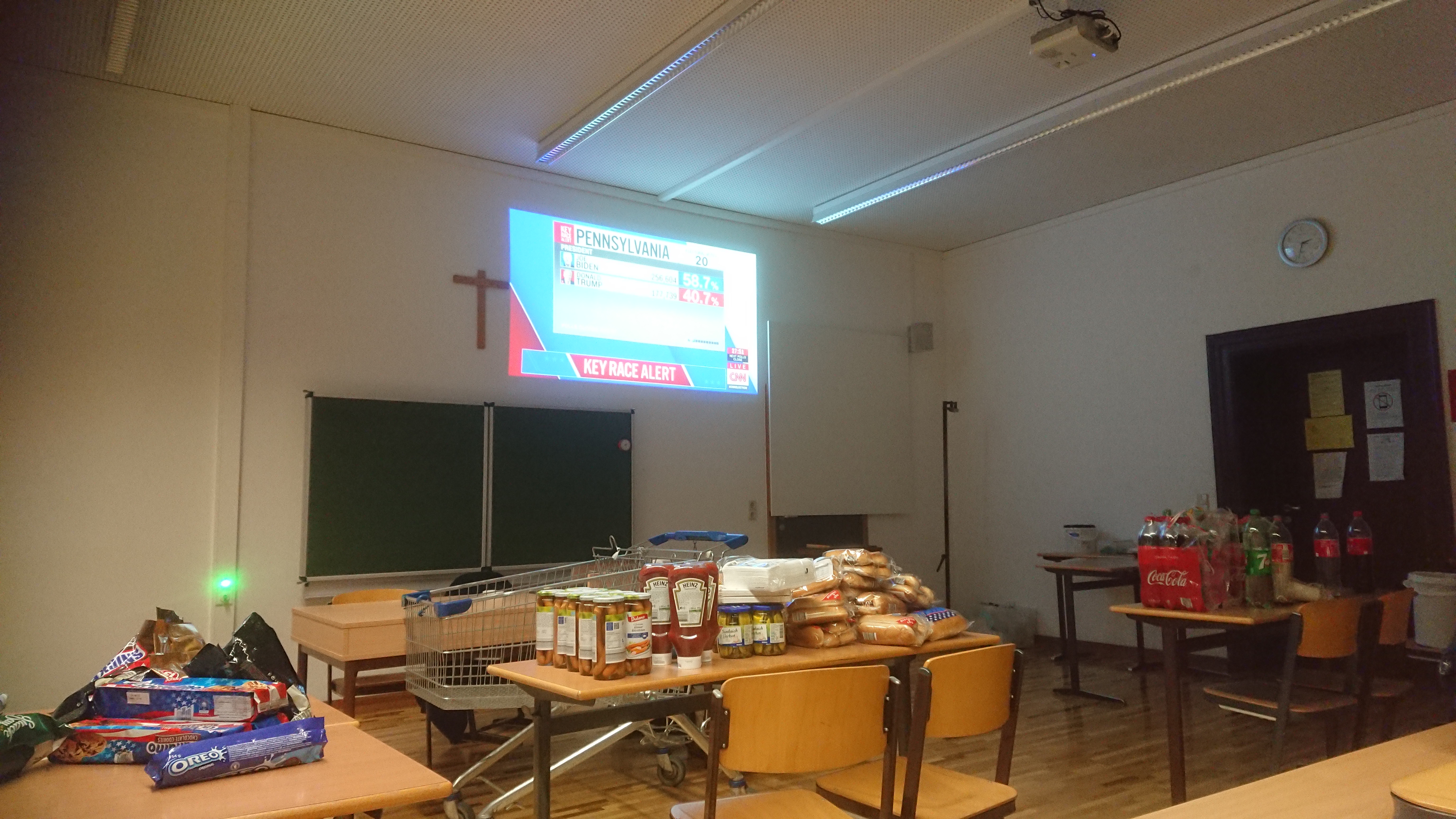 Am 4. November um 2 Uhr morgens klingelt das Telefon von Herrn Seeherr, Gemeinschaftskundelehrer der 10e: "Herr Seeherr, wir stehen an der Pforte!" - vier Schülerinnen und Schüler gehen durch das dunkle Gebäude ins Klassenzimmer, in dem kurz zuvor die anderen Teilnehmer der ersten Live-Verfolgung der Berichterstattung zur US-Präsidentenwahl mit einem Einkaufswagen voller Snacks erschienenen waren, damit die Nacht mit Hotdogs, Popcorn und Getränken versüßt wird.