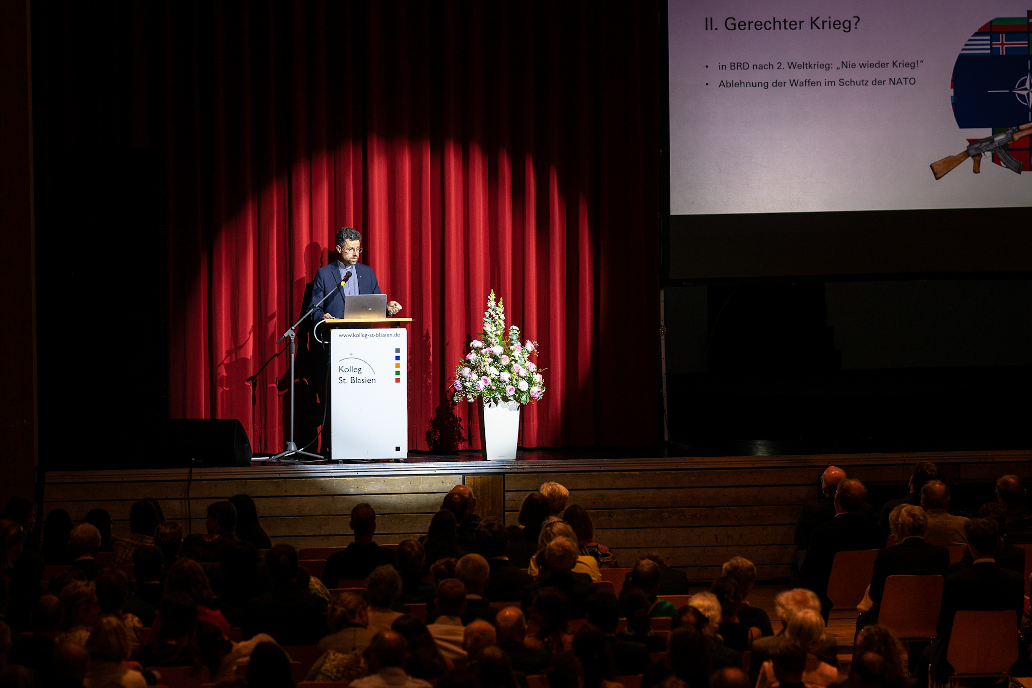Der Krieg in der Ukraine stellt die zeitgenössische Friedensethik vor große Herausforderungen: Waffenlieferungen, Einsatz militärischer Gewalt, Aufrüstung. Wie sollen wir mit diesen Fragen umgehen? Christinnen und Christen fragen sich, ob die Botschaft Jesu einen Pazifismus erfordert. Anliegen des Vortrags war es, die Sprachfähigkeit über ethische Fragen militärischer Gewalt zu erhöhen. Die Kriterien der Lehre vom „gerechten Krieg“ müssen neu diskutiert werden, so Hofmann SJ. In Deutschland wurden diese Kriterien lange Zeit beiseite geschoben, weil die NATO und die USA genügend Schutz boten. Diese Zeit scheint nun vorbei zu sein.