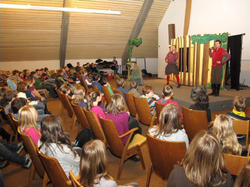 Das White Horse Theatre führte am Montagvormittag im Filmsaal zwei englischsprachige Theaterstücke am Kolleg auf. Für die Unterstufe stand ein lustiges Märchen "The Weasel in the Sack" auf dem Spielplan und in der Mittelstufe ging es bei "Sticks and Stones" um Mobbing in der Schule. Das pädagogische Tourneetheater ist inzwischen zur europaweit größten professionellen Theatergruppe dieser Art geworden und besteht aus Schauspielern, deren Muttersprache Englisch ist.