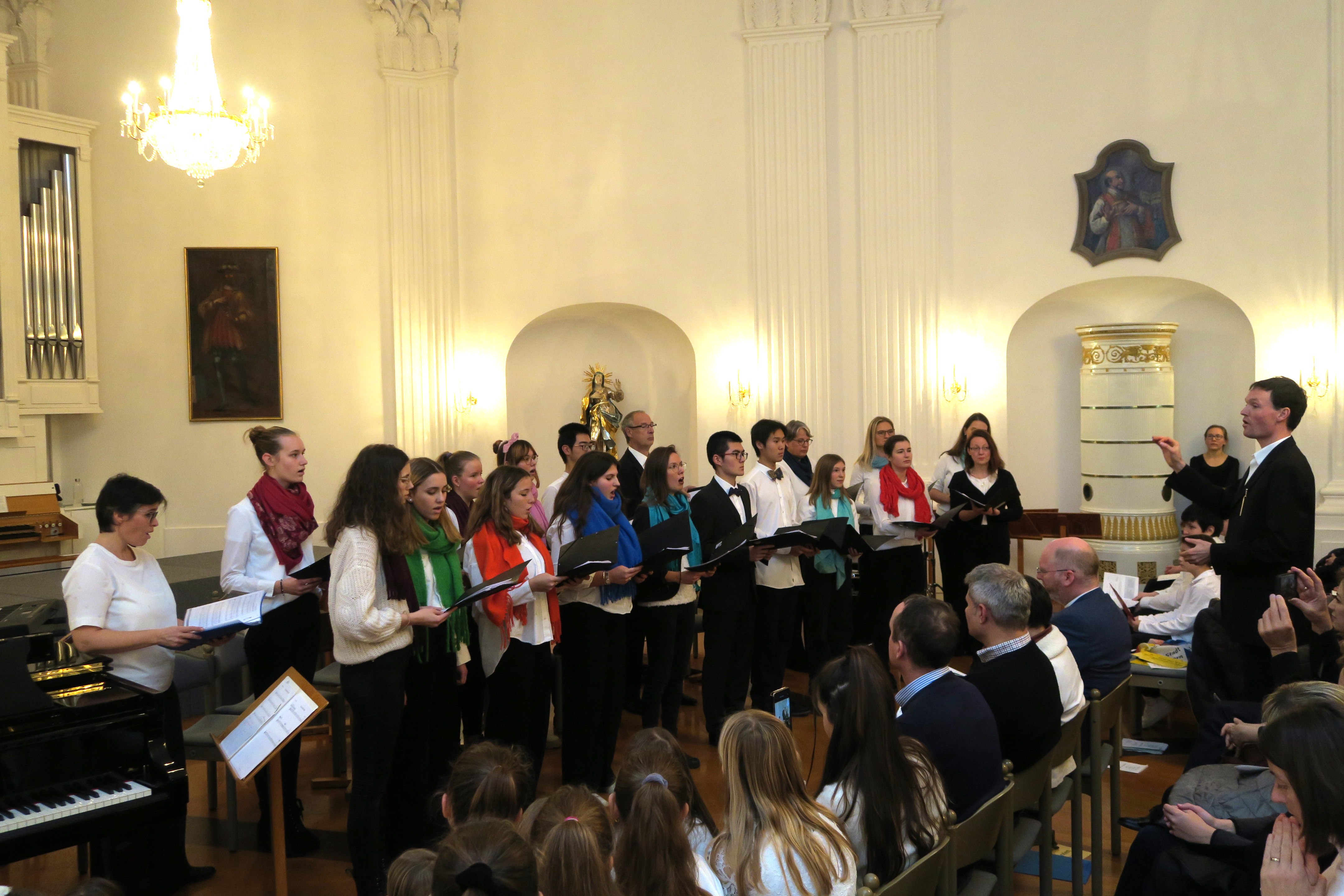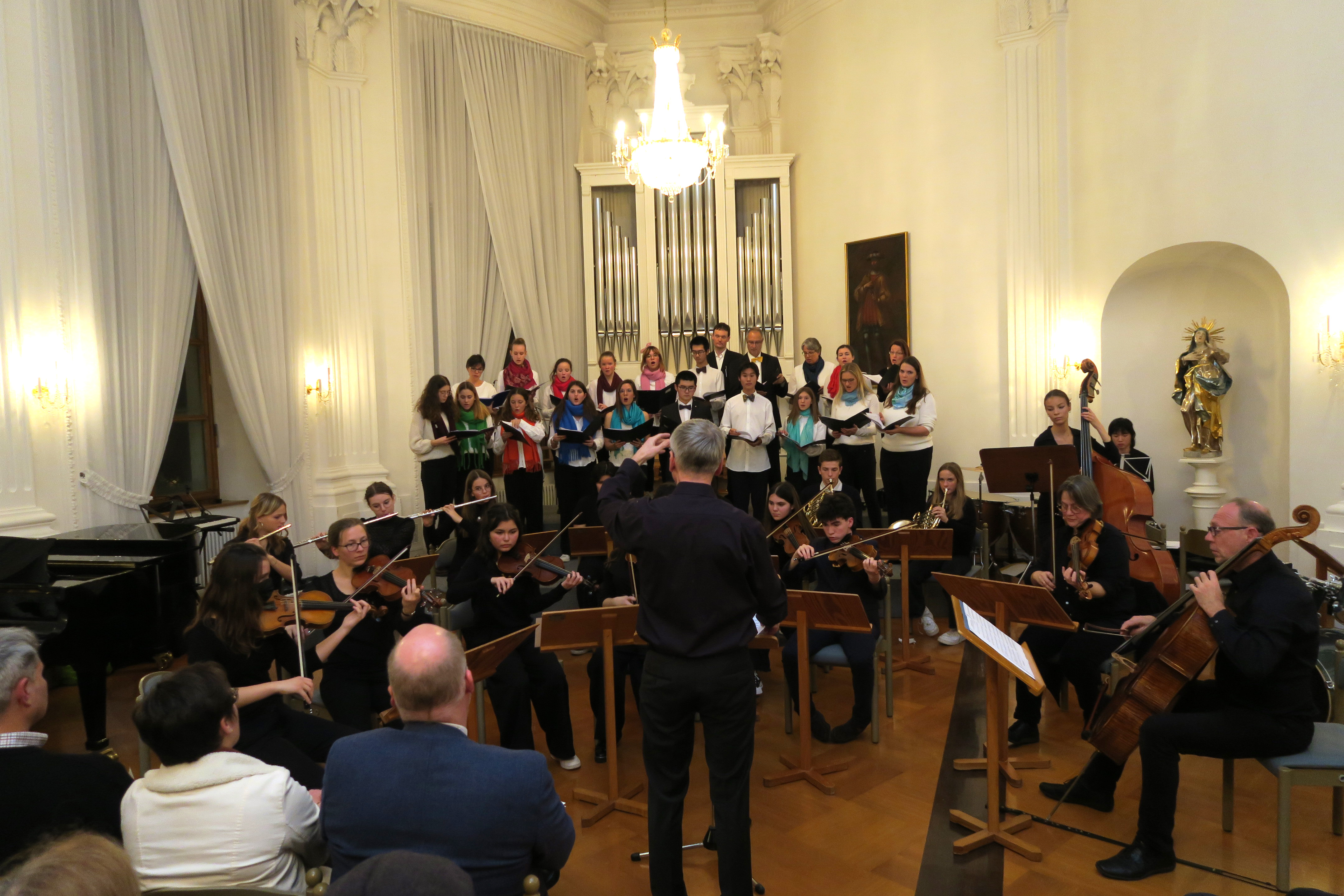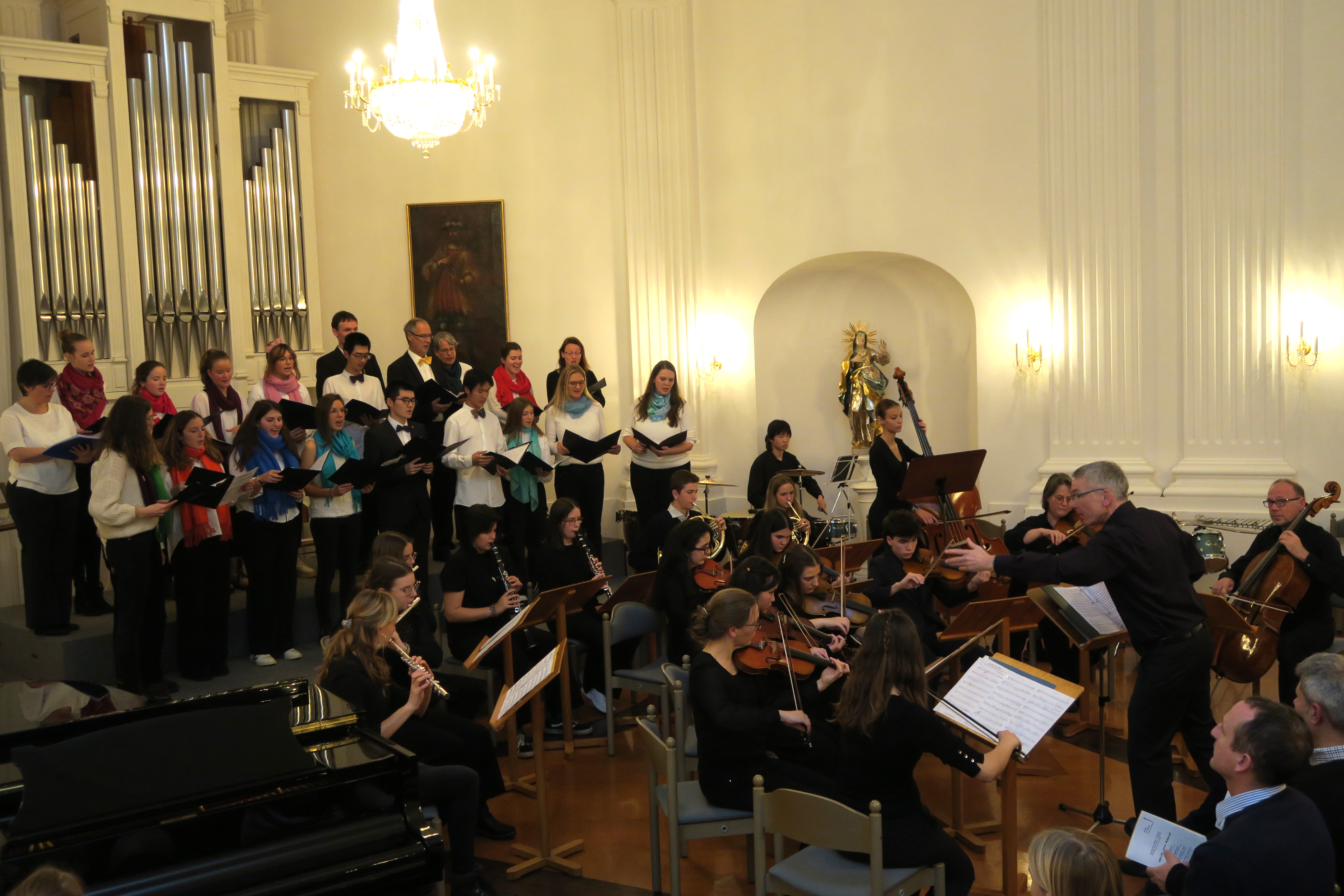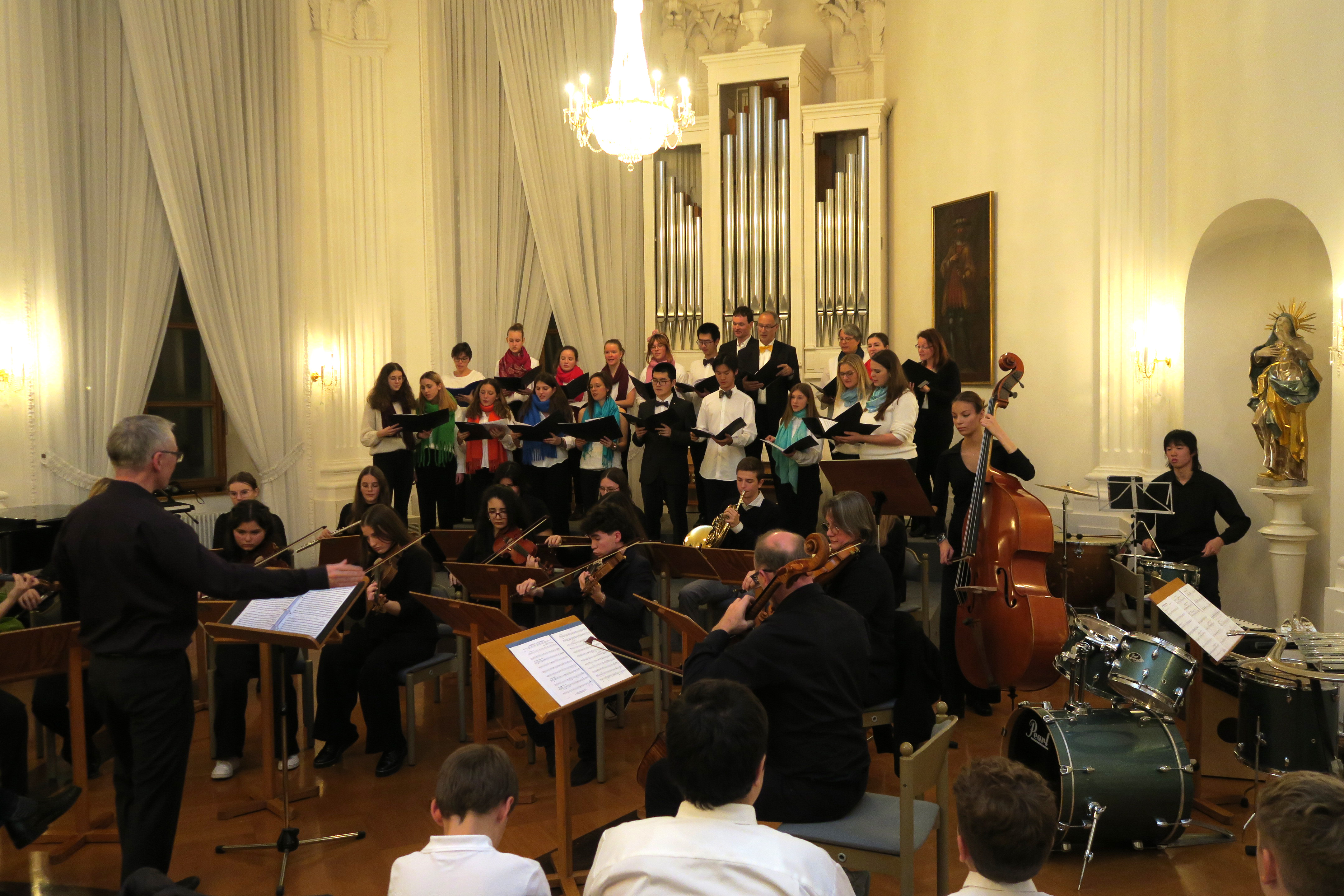 Zauberhafte Adventsmusik im wunderschönen Festsaal läutete am vergangenen zweiten Adventswochenende die Vorweihnachtszeit am Kolleg feierlich ein. Die beiden gelungenen Adventskonzerte mit ansprechenden Arrangements waren ein wunderbares Einklingen der festlichen Weihnachtszeit. Zahlreiche Zuhörer im proppenvollen Festsaal des Kollegs konnten 75 Minuten wieder dieses musikalische Ereignis „live“ genießen. Die verschiedenen musikalischen Gruppierungen – Unterstufenorchester (Leitung: Viola Grömminger), Unterstufenchor (Maria Backhaus), Kollegschor (Florian Auls) und Kollegsorchester (Klaus Weißenbach) - brachten adventliche Musik verschiedenster Epochen zu Gehör. Eine Presseresonanz über das Konzertereignis gibt es in der Badischen Zeitung.