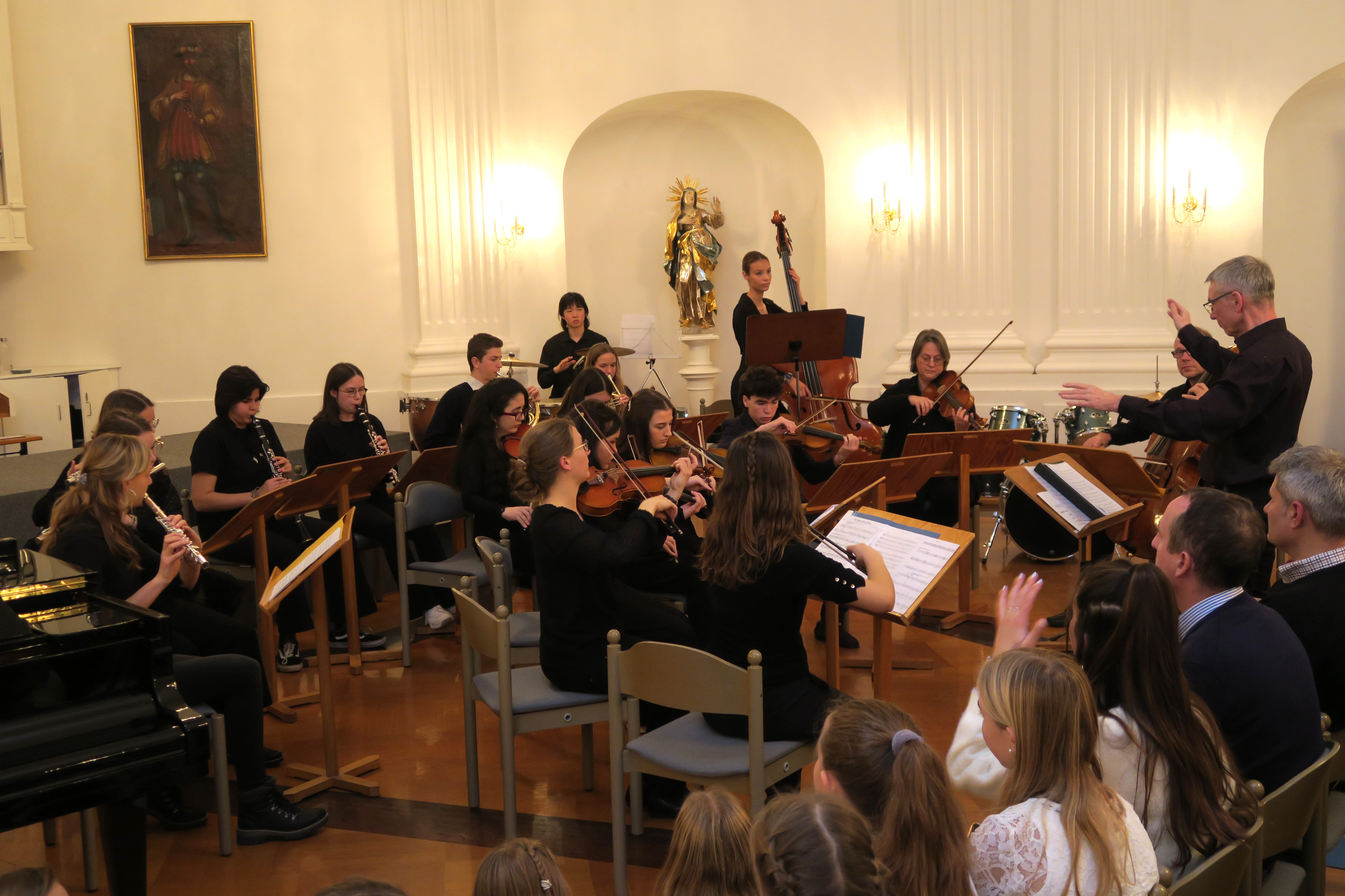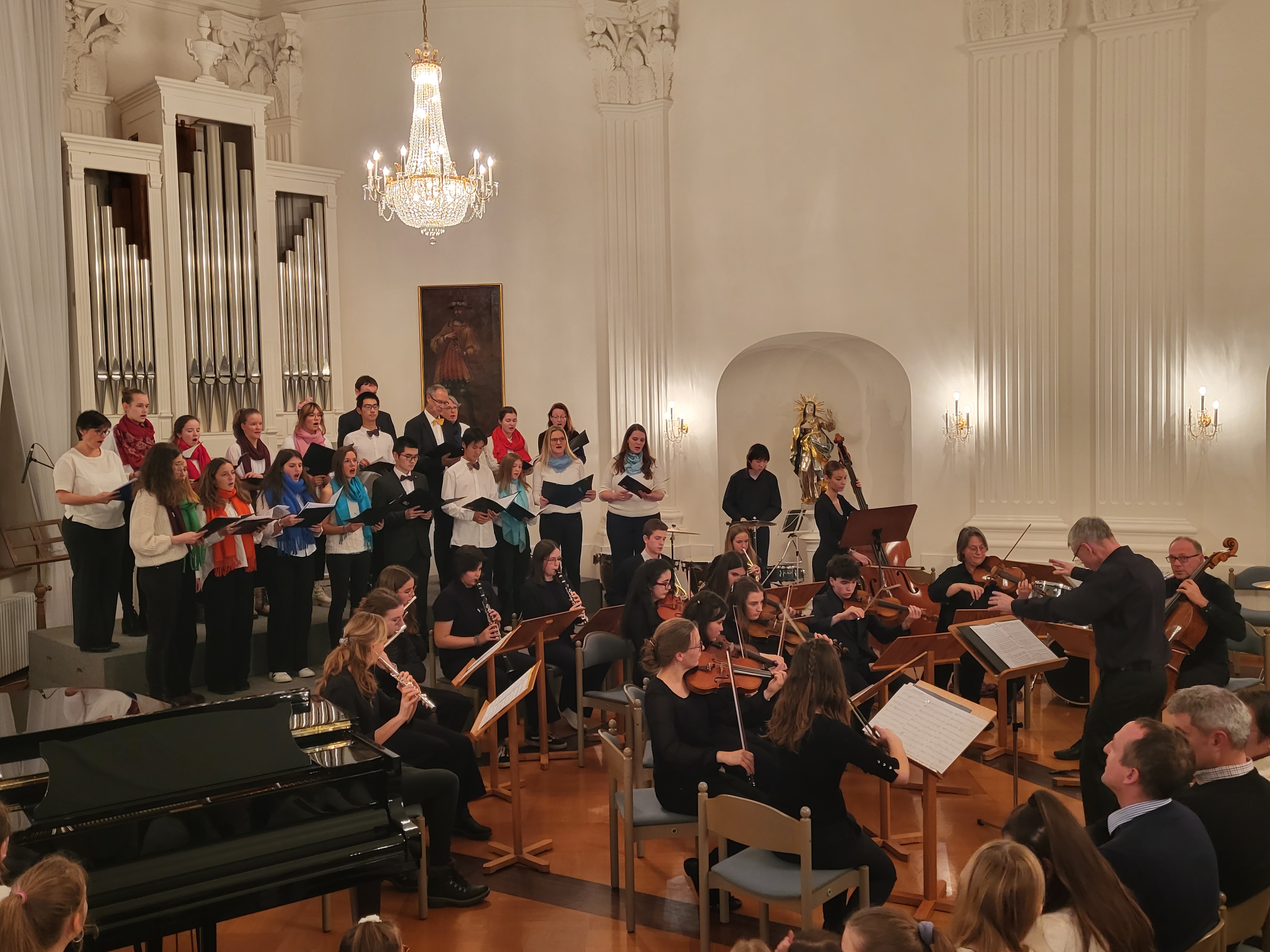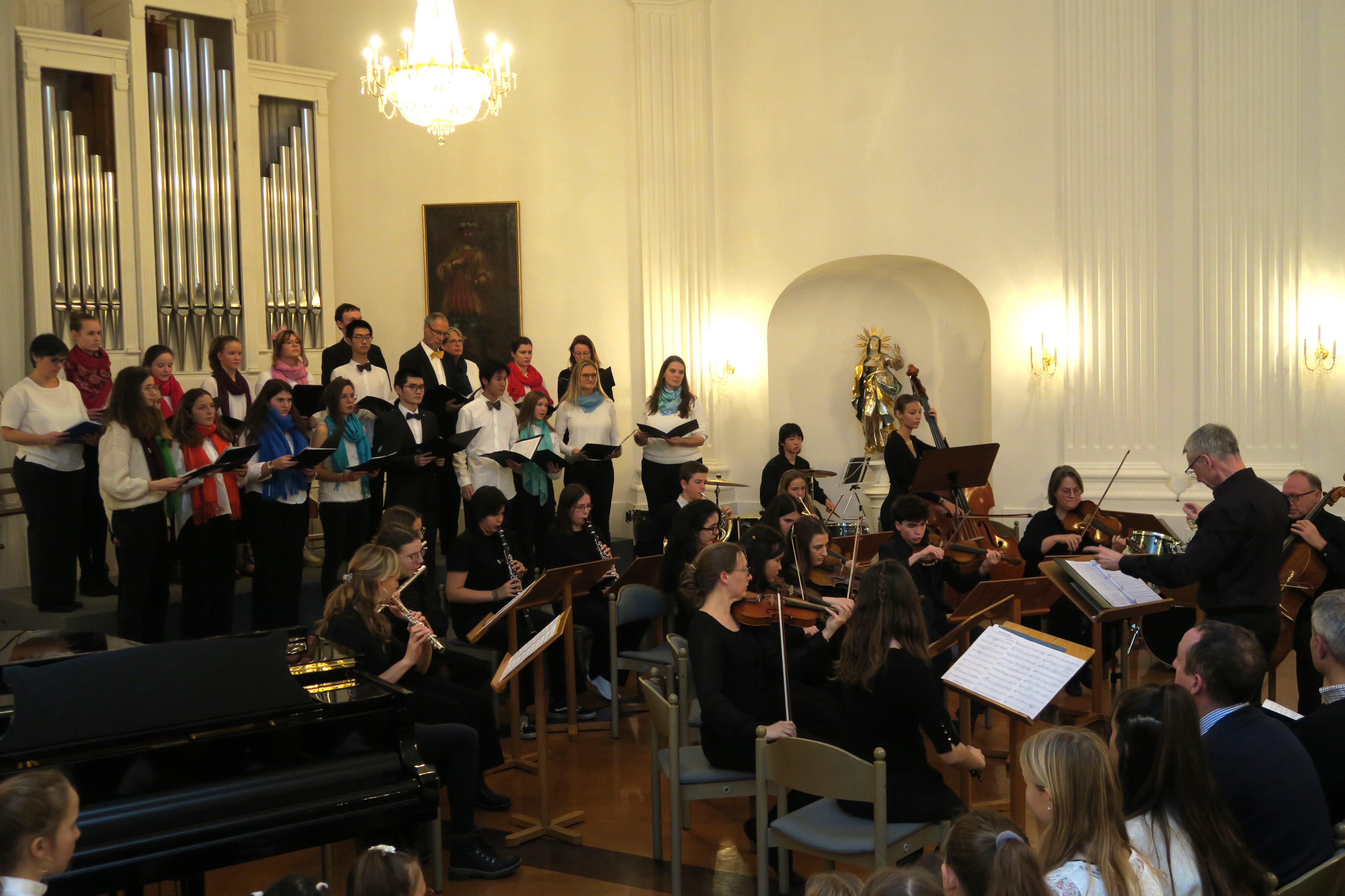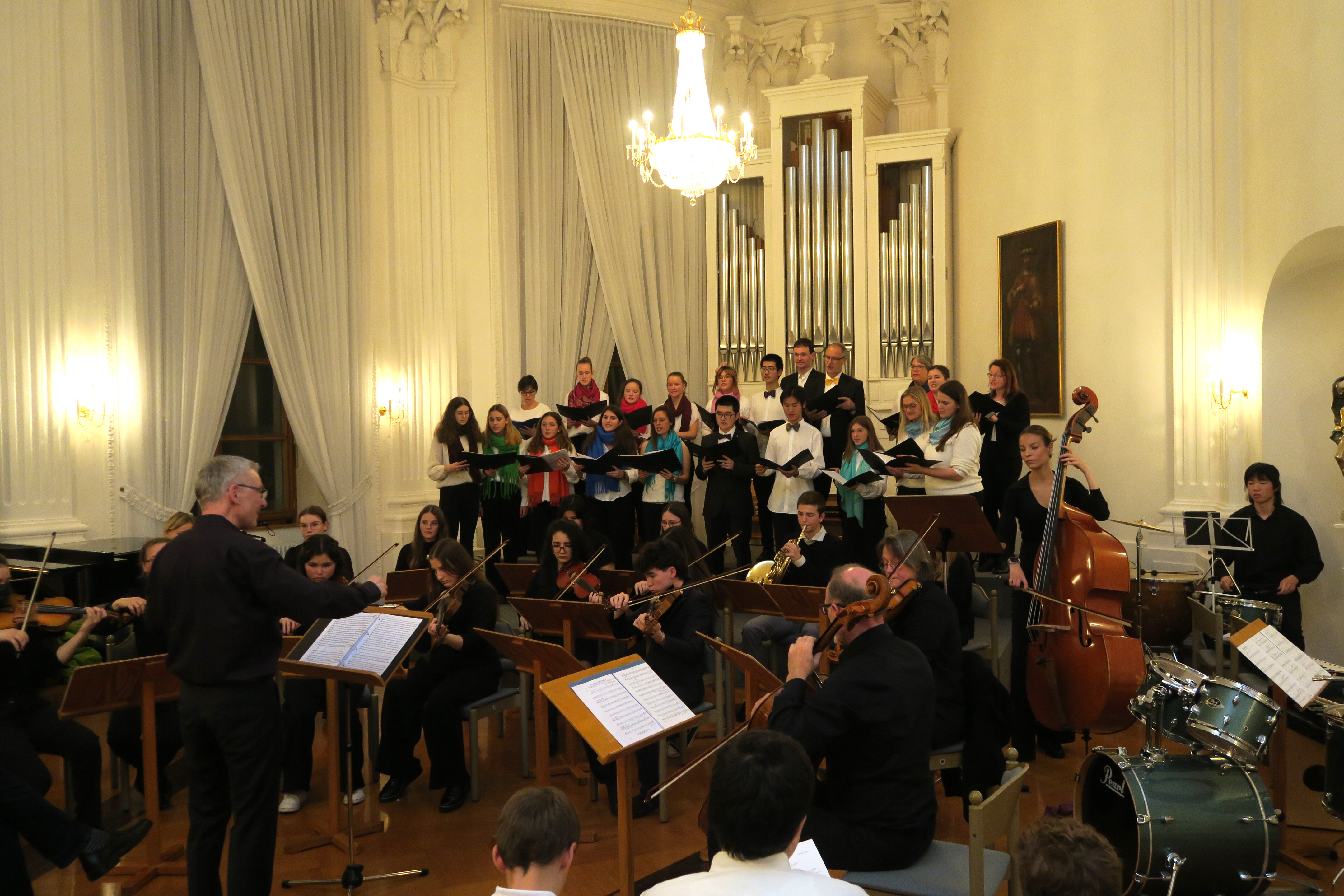 Zauberhafte Adventsmusik im wunderschönen Festsaal läutete am vergangenen zweiten Adventswochenende die Vorweihnachtszeit am Kolleg feierlich ein. Die beiden gelungenen Adventskonzerte mit ansprechenden Arrangements waren ein wunderbares Einklingen der festlichen Weihnachtszeit. Zahlreiche Zuhörer im proppenvollen Festsaal des Kollegs konnten 75 Minuten wieder dieses musikalische Ereignis „live“ genießen. Die verschiedenen musikalischen Gruppierungen – Unterstufenorchester (Leitung: Viola Grömminger), Unterstufenchor (Maria Backhaus), Kollegschor (Florian Auls) und Kollegsorchester (Klaus Weißenbach) - brachten adventliche Musik verschiedenster Epochen zu Gehör. Eine Presseresonanz über das Konzertereignis gibt es in der Badischen Zeitung.